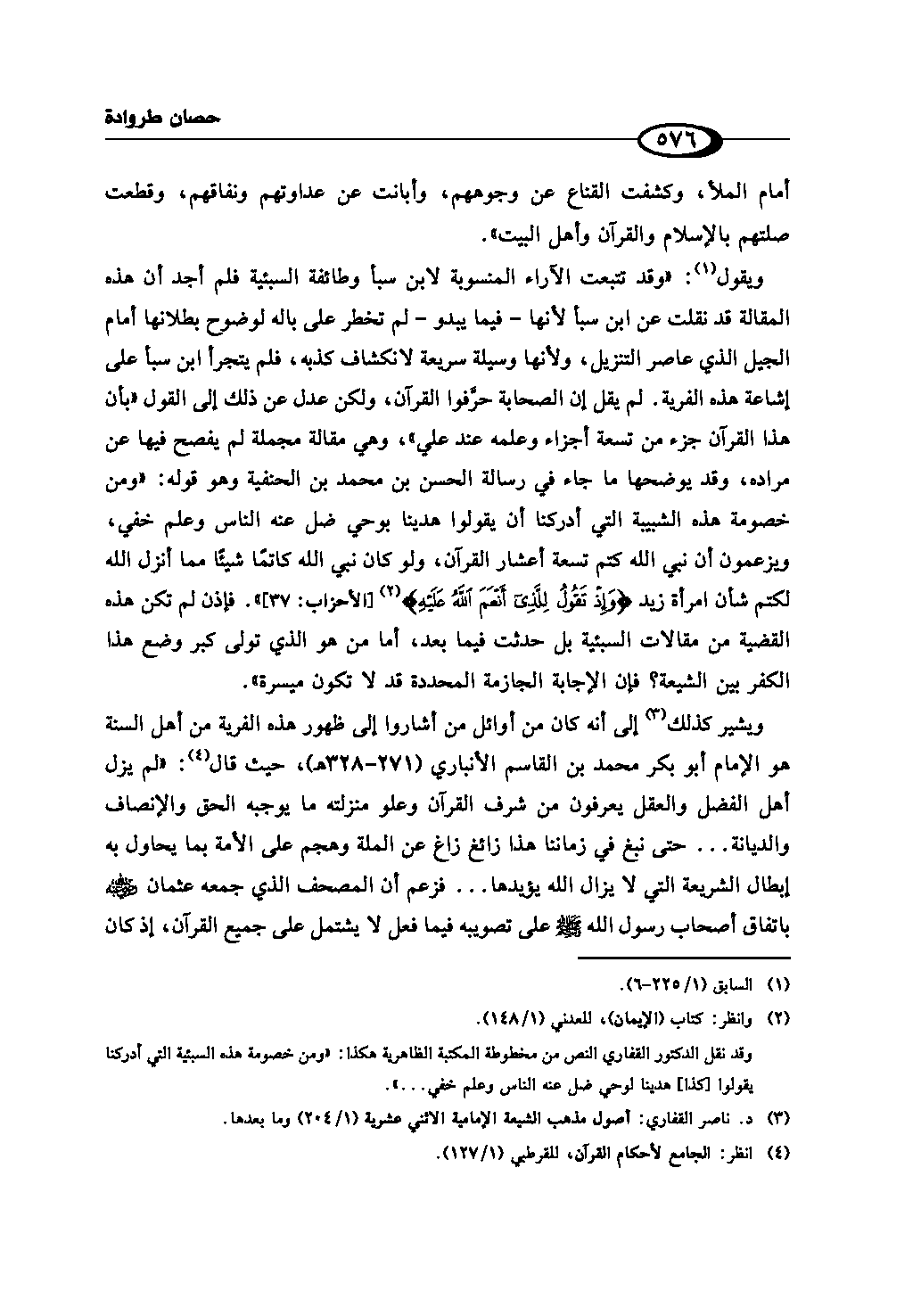 ويشير كذلك (¬3) إلى أنه كان من أوائل من أشاروا إلى ظهور هذه الفرية من أهل السنة هو الإمام أبو بكر محمد بن القاسم الأنباري (271 - 328هـ)، حيث قال (¬4): «لم يزل أهل الفضل والعقل يعرفون من شرف القرآن وعلو منزلته ما يوجبه الحق والإنصاف والديانة ... حتى نبغ في زماننا هذا زائغ زاغ عن الملة وهجم على الأمة بما يحاول به إبطال الشريعة التي لا يزال الله يؤيدها ... فزعم أن المصحف الذي جمعه عثمان - رضي الله عنه - باتفاق أصحاب رسول الله - صلى الله عليه وسلم - على تصويبه فيما فعل لا يشتمل على جميع القرآن، إذ كان