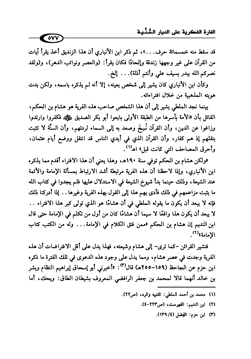 «ولكن هشام بن الحكم توفي سنة 190هـ، وهذا يعني أن هذا الافتراء أقدم مما يذكره ابن الأنباري، وإذا لاحظنا أن هذه الفرية مرتبطة أشد الارتباط بمسألة الإمامة والأئمة عند الشيعة، وذلك حينما بدأ شيوخ الشيعة في الاستدلال عليها فلم يجدوا في كتاب الله ما يثبت مزاعمهم في ذلك فأدى بهم هذا إلى القول بهذه الفرية وغيرها .. إذا أدركنا ذلك فإنه لا يبعد أن يكون ما يقوله الملطي في أن هشامًا هو الذي تولى كبر هذا الافتراء .. لا يبعد أن يكون هذا واقعًا لا سيما أن هشامًا كان من أول من تكلم في الإمامة حتى قال ابن النديم إن هشام بن الحكم «ممن فتق الكلام في الإمامة ... وله من الكتب كتاب الإمامة» (¬2).