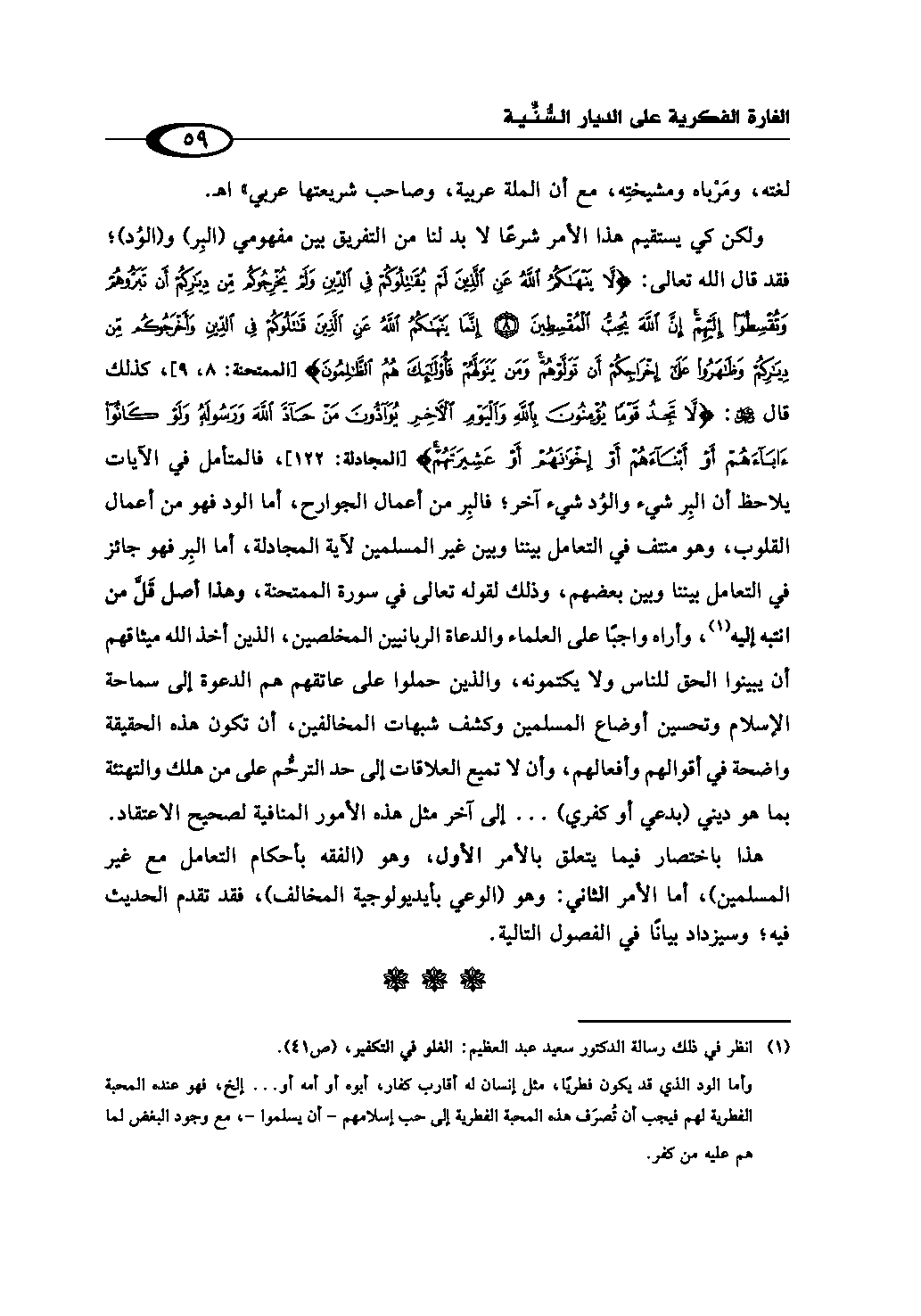 (¬3) انظر في ذلك رسالة الدكتور سعيد عبد العظيم: الغلو في التكفير، ص (41). وأما الود الذي قد يكون فطريًا، مثل إنسان له أقارب كفار، أبوه أو أمه أو ... إلخ، فهو عنده المحبة الفطرية لهم فيجب أن تُصرَف هذه المحبة الفطرية إلى حب إسلامهم - أن يسلموا -، مع وجود البغض لما هم عليه من كفر ..