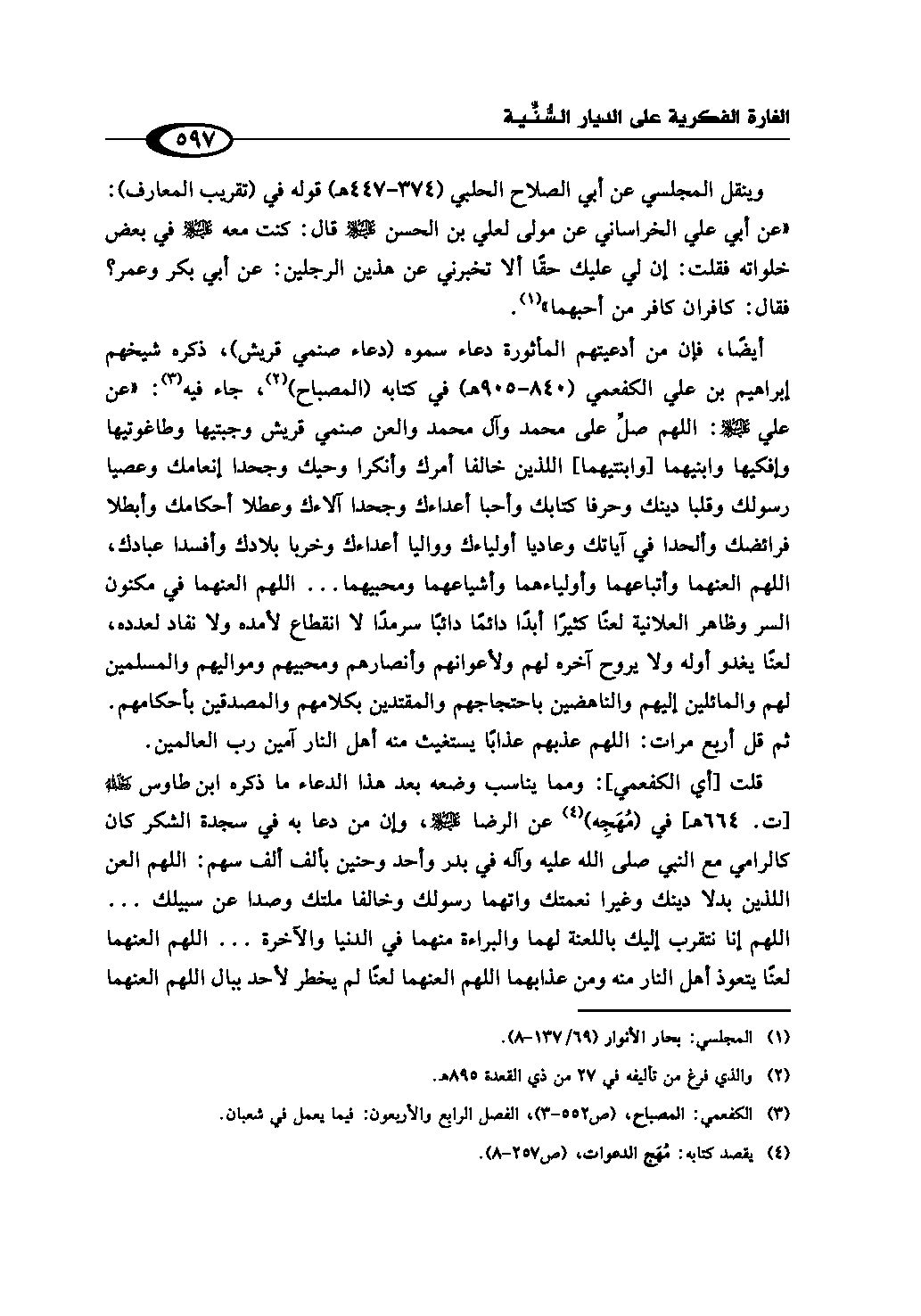 أيضًا، فإن من أدعيتهم المأثورة دعاء سموه (دعاء صنمي قريش)، ذكره شيخهم إبراهيم بن علي الكفعمي (840 - 905هـ) في كتابه (المصباح) (¬2)، جاء فيه (¬3): «عن علي - عليه السلام -: اللهم صلِّ على محمد وآل محمد والعن صنمي قريش وجبتيها وطاغوتيها وإفكيها وابنيهما [وابنتيهما] اللذين خالفا أمرك وأنكرا وحيك وجحدا إنعامك وعصيا رسولك وقلبا دينك وحرفا كتابك وأحبا أعداءك وجحدا آلاءك وعطلا أحكامك وأبطلا فرائضك وألحدا في آياتك وعاديا أولياءك وواليا أعداءك وخربا بلادك وأفسدا عبادك، اللهم العنهما وأتباعهما وأولياءهما وأشياعهما ومحبيهما ... اللهم العنهما في مكنون السر وظاهر العلانية لعنًا كثيرًا أبدًا دائمًا دائبًا سرمدًا لا انقطاع لأمده ولا نفاد لعدده، لعنًا يغدو أوله ولا يروح آخره لهم ولأعوانهم وأنصارهم ومحبيهم ومواليهم والمسلمين لهم والمائلين إليهم والناهضين باحتجاجهم والمقتدين بكلامهم والمصدقين بأحكامهم. ثم قل أربع مرات: اللهم عذبهم عذابًا يستغيث منه أهل النار آمين رب العالمين.