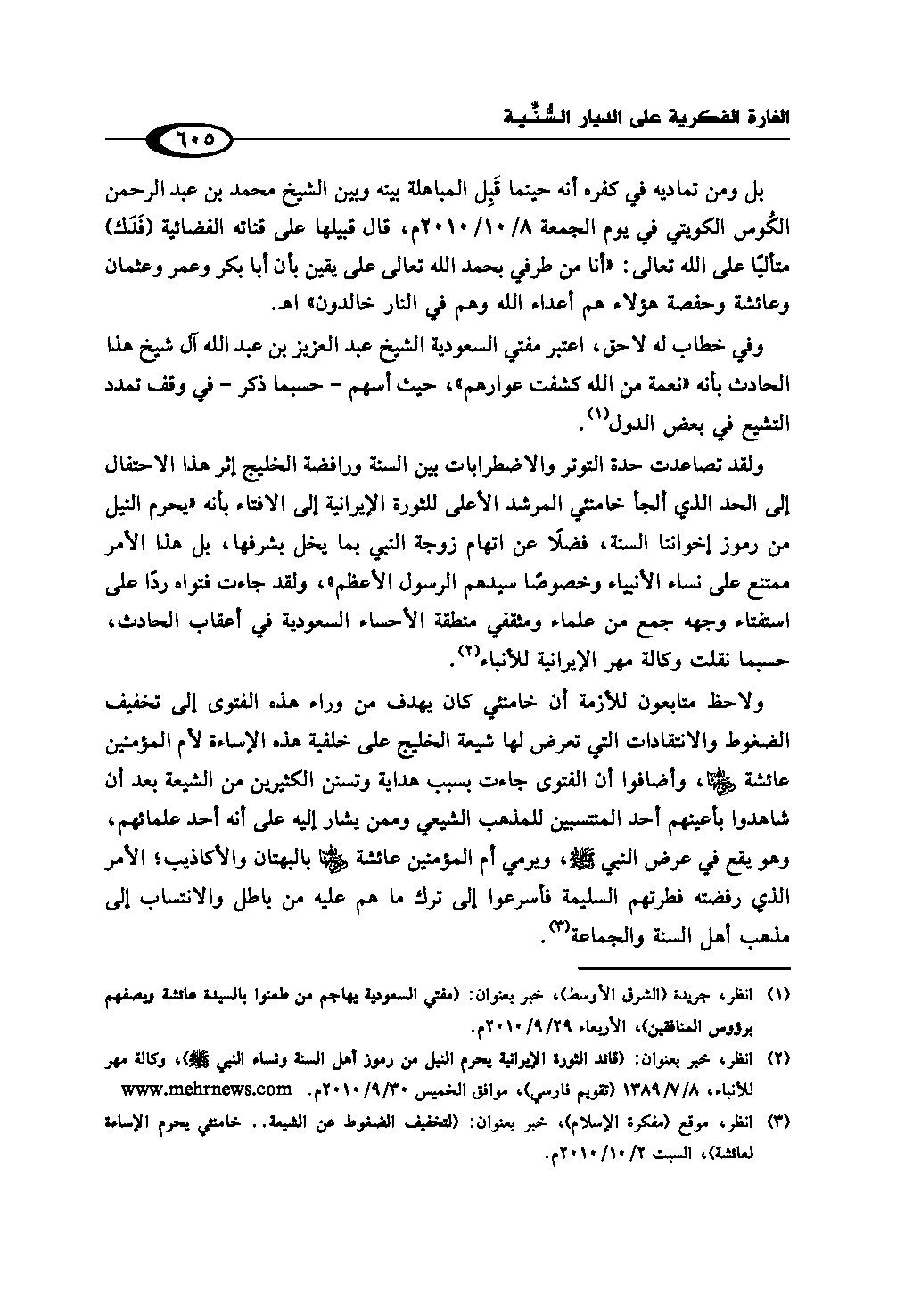 (¬2) انظر، خبر بعنوان: (قائد الثورة الإيرانية يحرم النيل من رموز أهل السنة ونساء النبي - صلى الله عليه وسلم -)، وكالة مهر للأنباء، 8/ 7/1389 (تقويم فارسي)، موافق الخميس 30/ 9/2010م. www.mehrnews.com