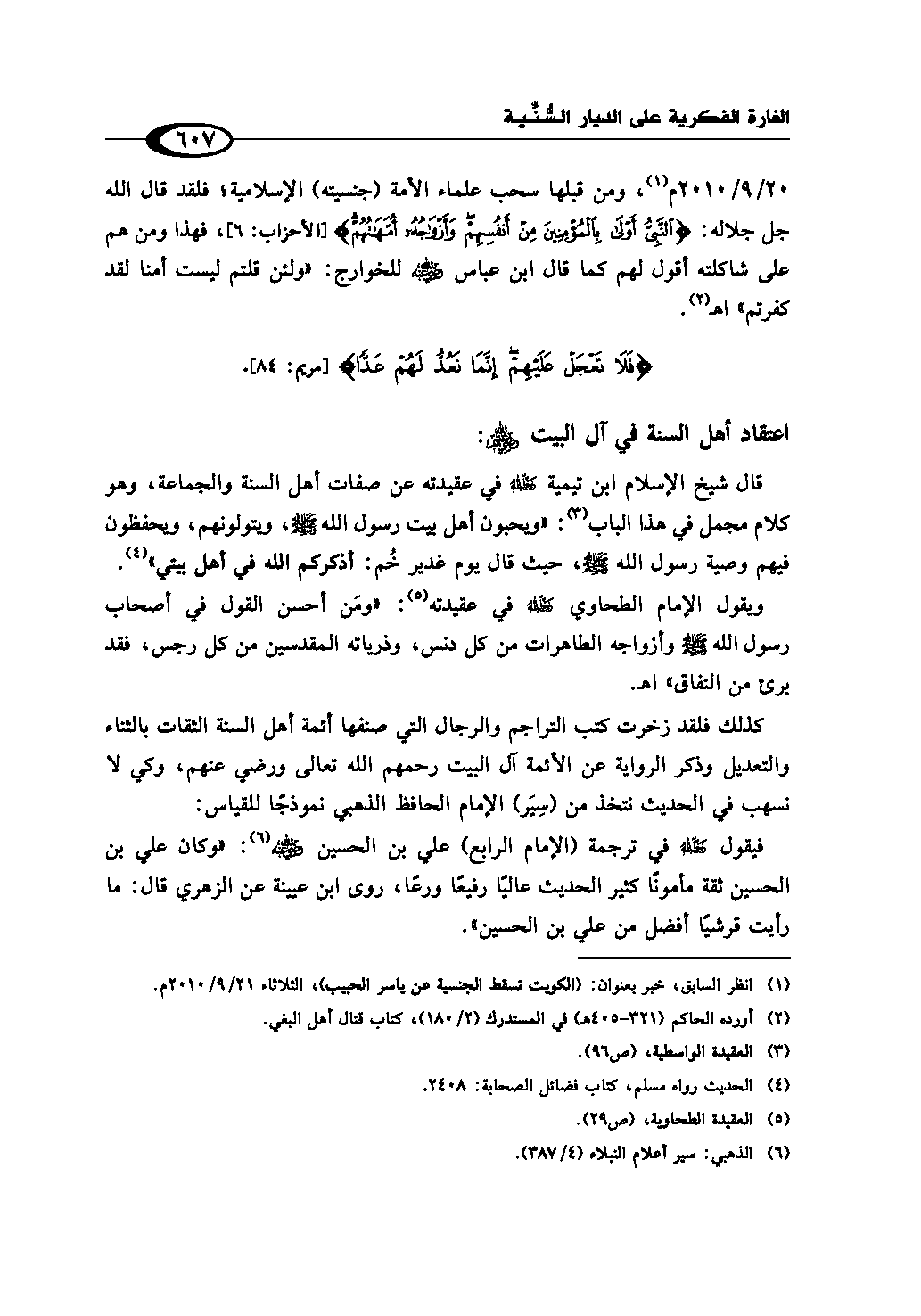 20/ 9/2010م (¬1)، ومن قبلها سحب علماء الأمة (جنسيته) الإسلامية؛ فلقد قال الله - جل جلاله -: {النَّبِيُّ أَوْلَى بِالْمُؤْمِنِينَ مِنْ أَنفُسِهِمْ وَأَزْوَاجُهُ أُمَّهَاتُهُمْ} (¬2)، فهذا ومن هم على شاكلته أقول لهم كما قال ابن عباس - رضي الله عنه - للخوارج: «ولئن قلتم ليست أمنا لقد كفرتم» اهـ (¬3).