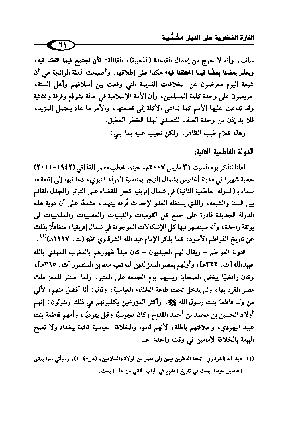 فلعلنا نتذكر يوم السبت 31 مارس 2007م، حينما خطب معمر القذافي (1942 - 2011م) خطبة شهيرة في مدينة أغاديس بشمال النيجر بمناسبة المولد النبوي، دعا فيها إلى إقامة ما سماه بـ (الدولة الفاطمية الثانية) في شمال إفريقيا كحل للقضاء على التوتر والجدل القائم بين السنة والشيعة، والذي يستغله العدو لإحداث فُرقة بينهما، مشددًا على أن هوية هذه الدولة الجديدة قادرة على جمع كل القوميات والقبليات والعصبيات والمذهبيات في بوتقة واحدة، وأنه سينصهر فيها كل الإشكالات الموجودة في شمال إفريقيا، متغافلًا بذلك عن تاريخ الفواطم الأسود، كما يذكر الإمام عبد الله الشرقاوي رحمه الله (ت. 1227هـ) (¬1): «دولة الفواطم - ويقال لهم العبيديون - كان مبدأ ظهورهم بالمغرب المهدي بالله عبيد الله [ت. 322هـ]، وأولهم بمصر المعز لدين الله تميم معد بن المنصور [ت. 365هـ]، وكان رافضيًا يبغض الصحابة ويسبهم يوم الجمعة على المنبر. ولما استقر للمعز ملك مصر انفرد بها، ولم يدخل تحت طاعة الخلفاء العباسية، وقال: أنا أفضل منهم، لأني من ولد فاطمة بنت رسول الله - صلى الله عليه وسلم -، وأكثر المؤرخين يكذبونهم في ذلك ويقولون: إنهم أولاد الحسين بن محمد بن أحمد القداح وكان مجوسيًا وقيل يهوديًا، وأمهم فاطمة بنت عبيد اليهودي، وخلافتهم باطلة؛ لأنهم قاموا والخلافة العباسية قائمة ببغداد ولا تصح البيعة بالخلافة لإمامين في وقت واحد» اهـ.