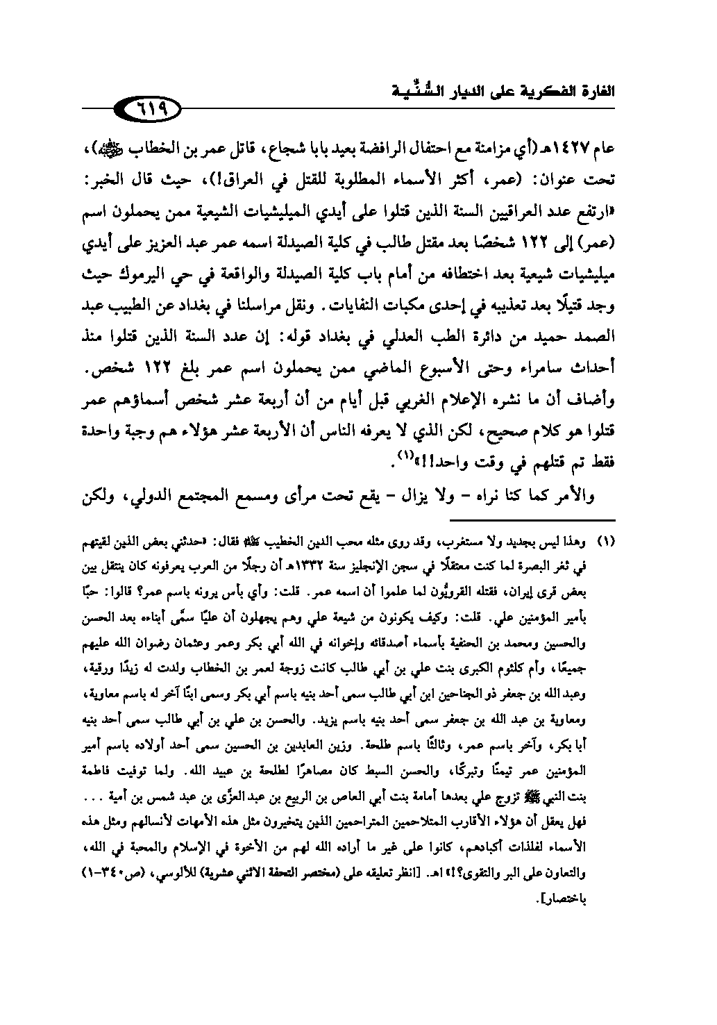 (¬1) وهذا ليس بجديد ولا مستغرب، وقد روى مثله محب الدين الخطيب رحمه الله فقال: «حدثني بعض الذين لقيتهم في ثغر البصرة لما كنت معتقلًا في سجن الإنجليز سنة 1332هـ أن رجلًا من العرب يعرفونه كان ينتقل بين بعض قرى إيران، فقتله القرويُّون لما علموا أن اسمه عمر. قلت: وأي بأس يرونه باسم عمر؟ قالوا: حبًا بأمير المؤمنين علي .. قلت: وكيف يكونون من شيعة علي وهم يجهلون أن عليًا سمَّى أبناءه بعد الحسن والحسين ومحمد بن الحنفية بأسماء أصدقائه وإخوانه في الله أبي بكر وعمر وعثمان رضوان الله عليهم جميعًا، وأم كلثوم الكبرى بنت علي بن أبي طالب كانت زوجة لعمر بن الخطاب ولدت له زيدًا ورقية، وعبد الله بن جعفر ذو الجناحين ابن أبي طالب سمى أحد بنيه باسم أبي بكر وسمى ابنًا آخر له باسم معاوية، ومعاوية بن عبد الله بن جعفر سمى أحد بنيه باسم يزيد. والحسن بن علي بن أبي طالب سمى أحد بنيه أبا بكر، وآخر باسم عمر، وثالثًا باسم طلحة. وزين العابدين بن الحسين سمى أحد أولاده باسم أمير المؤمنين عمر تيمنًا وتبركًا، والحسن السبط كان مصاهرًا لطلحة بن عبيد الله. ولما توفيت فاطمة بنت النبي - صلى الله عليه وسلم - تزوج علي بعدها أمامة بنت أبي العاص بن الربيع بن عبد العزَّى بن عبد شمس بن أمية ... فهل يعقل أن هؤلاء الأقارب المتلاحمين المتراحمين الذين يتخيرون مثل هذه الأمهات لأنسالهم ومثل هذه الأسماء لفلذات أكبادهم، كانوا على غير ما أراده الله لهم من الأخوة في الإسلام والمحبة في الله، والتعاون على البر والتقوى؟!» اهـ. [انظر تعليقه على (مختصر التحفة الاثني عشرية) للألوسي، ص (340 - 1) باختصار].