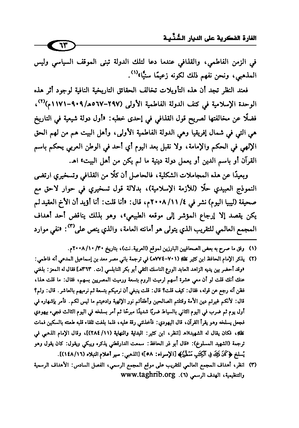 فعند النظر تجد أن هذه التأويلات تخالف الحقائق التاريخية النافية لوجود أثر هذه الوحدة الإسلامية في كنف الدولة الفاطمية الأولى (297 - 567هـ/909 - 1171م) (¬2)، فضلًا عن مخالفتها لصريح قول القذافي في إحدى خطبه: «أول دولة شيعية في التاريخ هي التي في شمال إفريقيا وهي الدولة الفاطمية الأولى، وأهل البيت هم من لهم الحق الإلهي في الحكم والإمامة، ولا نقبل بعد اليوم أي أحد في الوطن العربي يحكم باسم القرآن أو باسم الدين أو يعمل دولة دينية ما لم يكن من أهل البيت» اهـ.