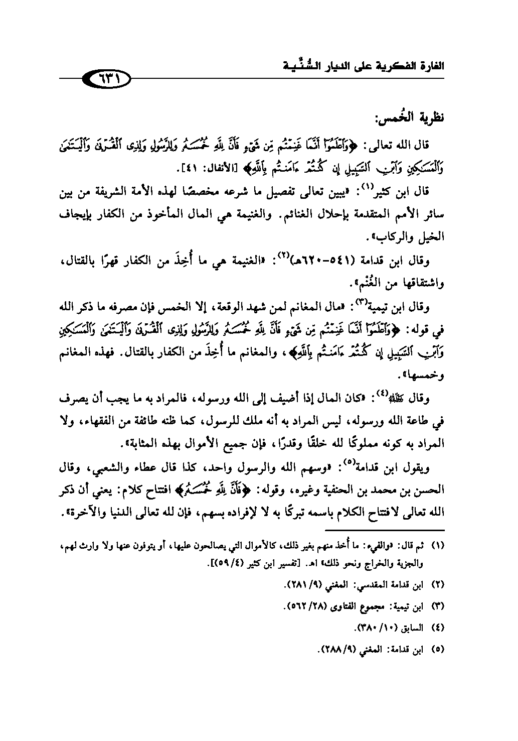وقال ابن تيمية (¬4): «مال المغانم لمن شهد الوقعة، إلا الخمس فإن مصرفه ما ذكر الله في قوله: {وَاعْلَمُوا أَنَّمَا غَنِمْتُم مِّن شَيْءٍ فَأَنَّ لِلّهِ خُمُسَهُ وَلِلرَّسُولِ وَلِذِي الْقُرْبَى وَالْيَتَامَى وَالْمَسَاكِينِ وَابْنِ السَّبِيلِ إِن كُنتُمْ آمَنتُمْ بِاللهِ}، والمغانم ما أُخِذَ من الكفار بالقتال. فهذه المغانم وخمسها». وقال رحمه الله (¬5): «كان المال إذا أضيف إلى الله ورسوله، فالمراد به ما يجب أن يصرف في طاعة الله ورسوله، ليس المراد به أنه ملك للرسول، كما ظنه طائفة من الفقهاء، ولا المراد به كونه مملوكًا لله خلقًا وقدرًا، فإن جميع الأموال بهذه المثابة».
