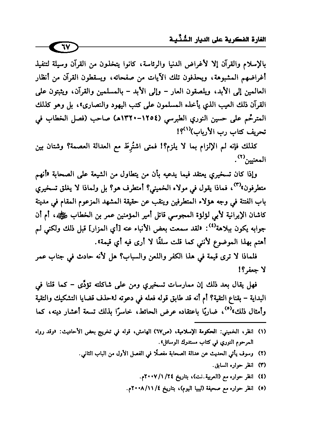 (¬1) انظر، الخميني: الحكومة الإسلامية، ص (67) الهامش، قوله في تخريج بعض الأحاديث: «وقد رواه المرحوم النوري في كتاب مستدرك الوسائل».