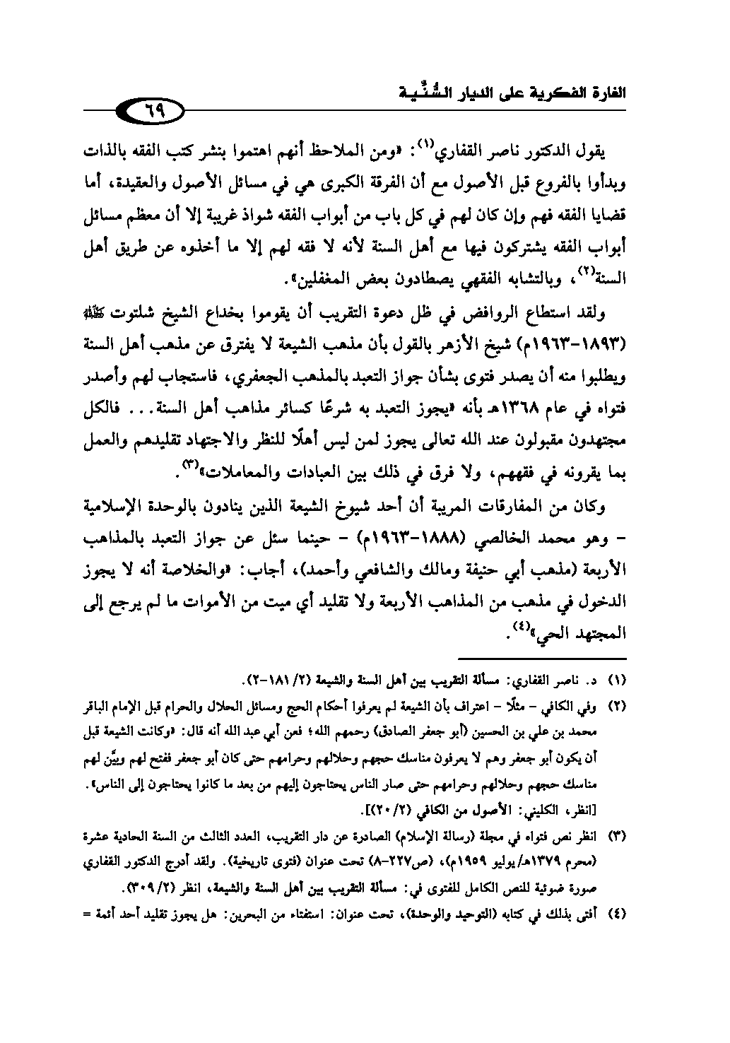 (¬4) أفتى بذلك في كتابه (التوحيد والوحدة)، تحت عنوان: استفتاء من البحرين: هل يجوز تقليد أحد أئمة المذاهب الأربعة؟، ص (33 - 4)، ط. دار النشر والطباعة العراقية، بغداد. ولقد أدرج الدكتور القفاري صورة ضوئية للفتوى في كتابه، انظر السابق (2/ 313).