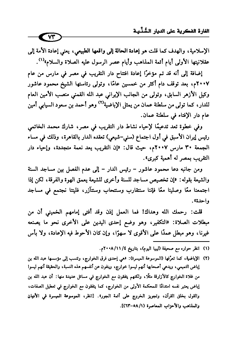 إضافة إلى أنه قد تم مؤخرًا إعادة افتتاح دار التقريب في مصر في مارس من عام 2007م، بعد توقف دام أكثر من خمسين عامًا، وتولى رئاستها الشيخ محمود عاشور وكيل الأزهر السابق، وتولى من الجانب الإيراني عبد الله القمني منصب الأمين العام للدار، كما تولى من سلطنة عمان من يمثل الإباضية (¬2) وهو أحمد بن سعود السيابي أمين عام دار الإفتاء في سلطنة عمان.