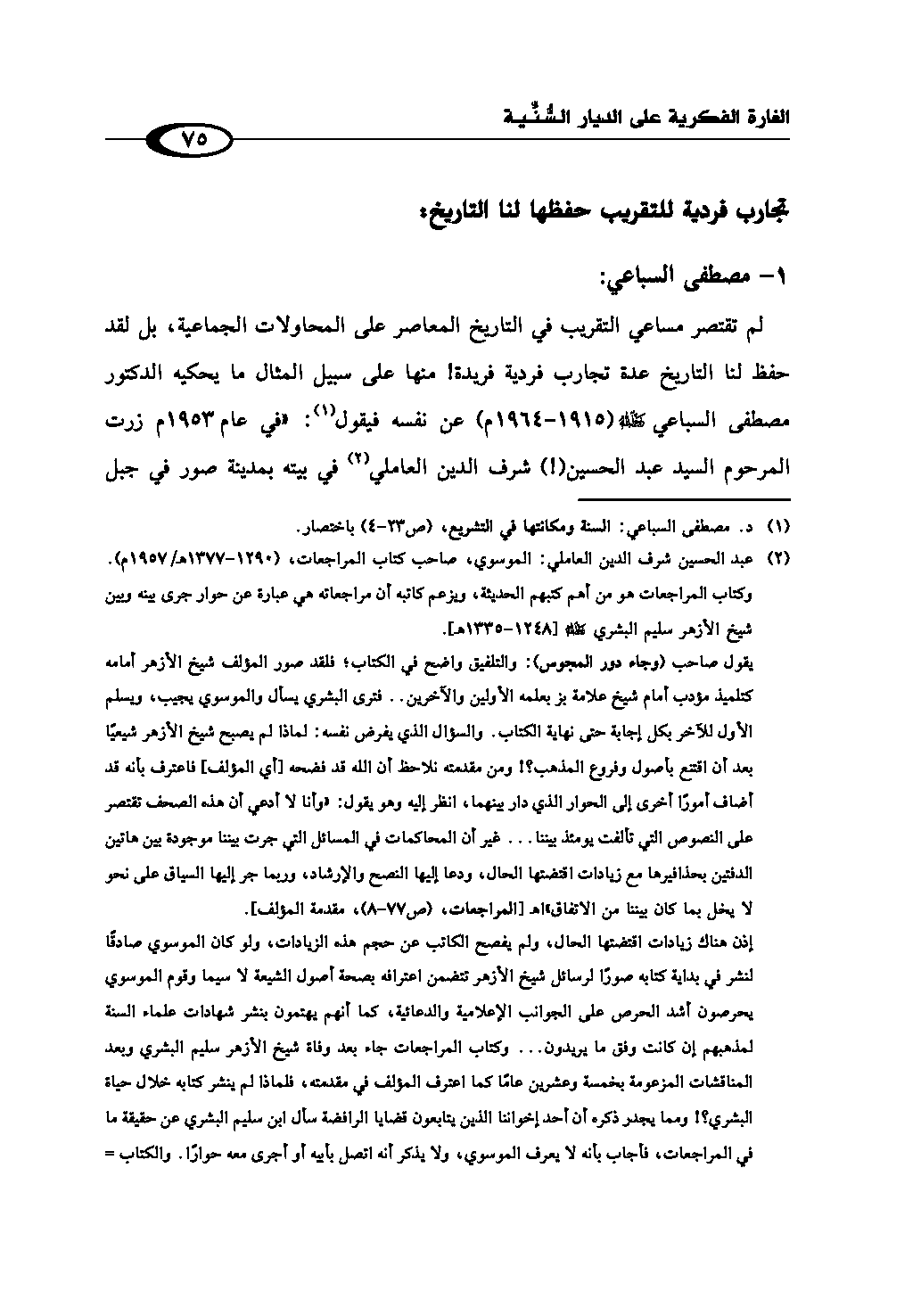 لم تقتصر مساعي التقريب في التاريخ المعاصر على المحاولات الجماعية، بل لقد حفظ لنا التاريخ عدة تجارب فردية فريدة! منها على سبيل المثال ما يحكيه الدكتور مصطفى السباعي رحمه الله (1915 - 1964م) عن نفسه فيقول (¬1): «في عام 1953م زرت المرحوم السيد عبد الحسين (!) شرف الدين العاملي (¬2)