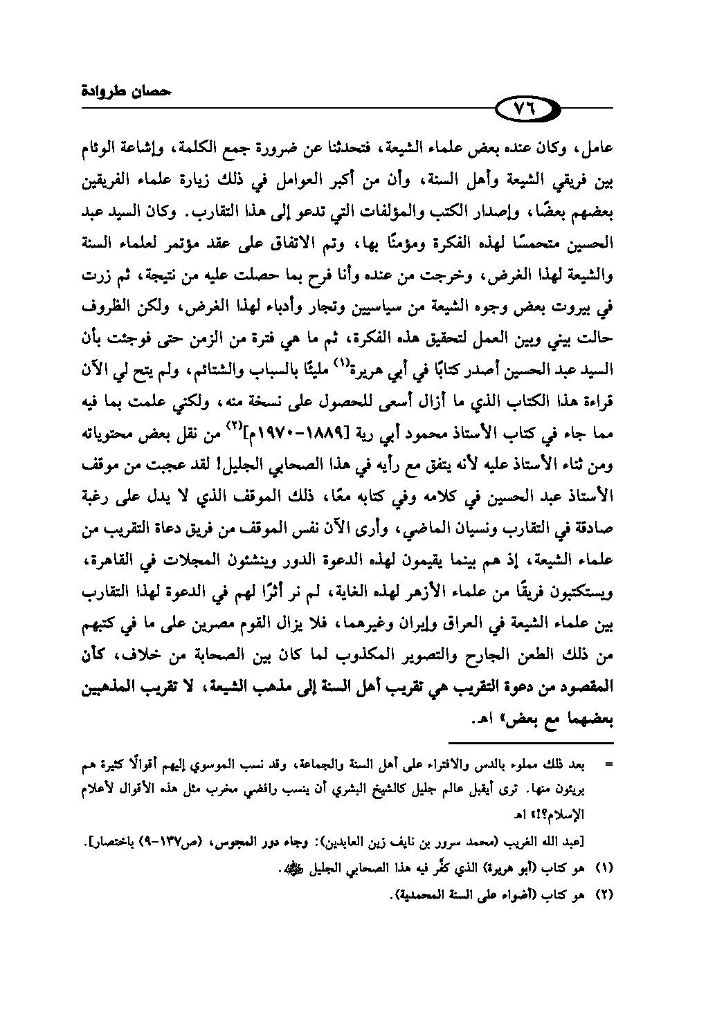 عامل، وكان عنده بعض علماء الشيعة، فتحدثنا عن ضرورة جمع الكلمة، وإشاعة الوئام بين فريقي الشيعة وأهل السنة، وأن من أكبر العوامل في ذلك زيارة علماء الفريقين بعضهم بعضًا، وإصدار الكتب والمؤلفات التي تدعو إلى هذا التقارب. وكان السيد عبد الحسين متحمسًا لهذه الفكرة ومؤمنًا بها، وتم الاتفاق على عقد مؤتمر لعلماء السنة والشيعة لهذا الغرض، وخرجت من عنده وأنا فرح بما حصلت عليه من نتيجة، ثم زرت في بيروت بعض وجوه الشيعة من سياسيين وتجار وأدباء لهذا الغرض، ولكن الظروف حالت بيني وبين العمل لتحقيق هذه الفكرة، ثم ما هي فترة من الزمن حتى فوجئت بأن السيد عبد الحسين أصدر كتابًا في أبي هريرة (¬1) مليئًا بالسباب والشتائم، ولم يتح لي الآن قراءة هذا الكتاب الذي ما أزال أسعى للحصول على نسخة منه، ولكني علمت بما فيه مما جاء في كتاب الأستاذ محمود أبي رية [1889 - 1970م] (¬2) من نقل بعض محتوياته ومن ثناء الأستاذ عليه لأنه يتفق مع رأيه في هذا الصحابي الجليل! لقد عجبت من موقف الأستاذ عبد الحسين في كلامه وفي كتابه معًا، ذلك الموقف الذي لا يدل على رغبة صادقة في التقارب ونسيان الماضي، وأرى الآن نفس الموقف من فريق دعاة التقريب من علماء الشيعة، إذ هم بينما يقيمون لهذه الدعوة الدور وينشئون المجلات في القاهرة، ويستكتبون فريقًا من علماء الأزهر لهذه الغاية، لم نر أثرًا لهم في الدعوة لهذا التقارب بين علماء الشيعة في العراق وإيران وغيرهما، فلا يزال القوم مصرين على ما في كتبهم من ذلك الطعن الجارح والتصوير المكذوب لما كان بين الصحابة من خلاف، كأن المقصود من دعوة التقريب هي تقريب أهل السنة إلى مذهب الشيعة، لا تقريب المذهبين بعضهما مع بعض» اهـ.