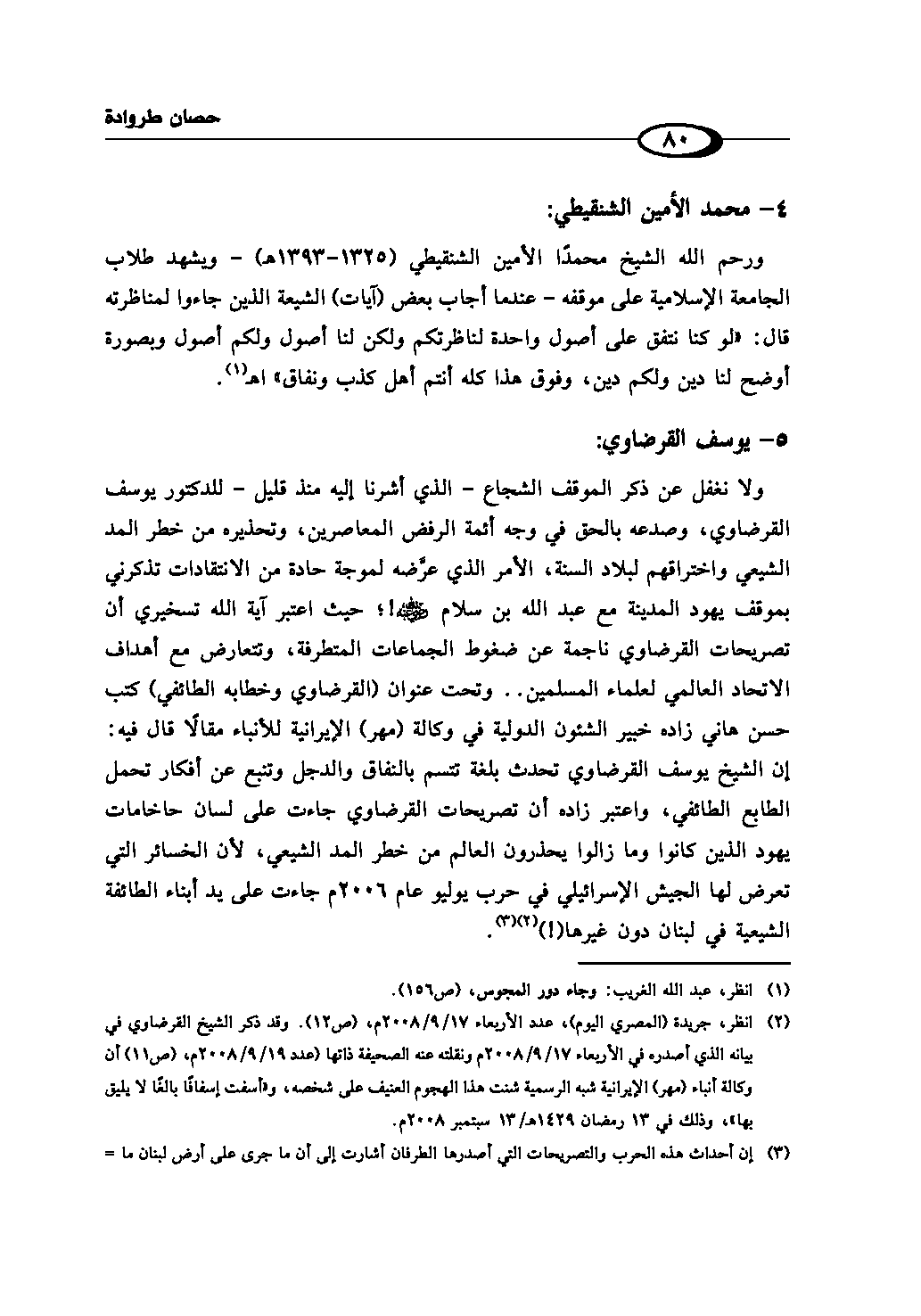 ولا نغفل عن ذكر الموقف الشجاع - الذي أشرنا إليه منذ قليل - للدكتور يوسف القرضاوي، وصدعه بالحق في وجه أئمة الرفض المعاصرين، وتحذيره من خطر المد الشيعي واختراقهم لبلاد السنة، الأمر الذي عرَّضه لموجة حادة من الانتقادات تذكرني بموقف يهود المدينة مع عبد الله بن سلام - رضي الله عنه -!؛ حيث اعتبر آية الله تسخيري أن تصريحات القرضاوي ناجمة عن ضغوط الجماعات المتطرفة، وتتعارض مع أهداف الاتحاد العالمي لعلماء المسلمين .. وتحت عنوان (القرضاوي وخطابه الطائفي) كتب حسن هاني زاده خبير الشئون الدولية في وكالة (مهر) الإيرانية للأنباء مقالًا قال فيه: إن الشيخ يوسف القرضاوي تحدث بلغة تتسم بالنفاق والدجل وتنبع عن أفكار تحمل الطابع الطائفي، واعتبر زاده أن تصريحات القرضاوي جاءت على لسان حاخامات يهود الذين كانوا وما زالوا يحذرون العالم من خطر المد الشيعي، لأن الخسائر التي تعرض لها الجيش الإسرائيلي في حرب يوليو عام 2006م جاءت على يد أبناء الطائفة الشيعية في لبنان دون غيرها (!) (¬2) (¬3).