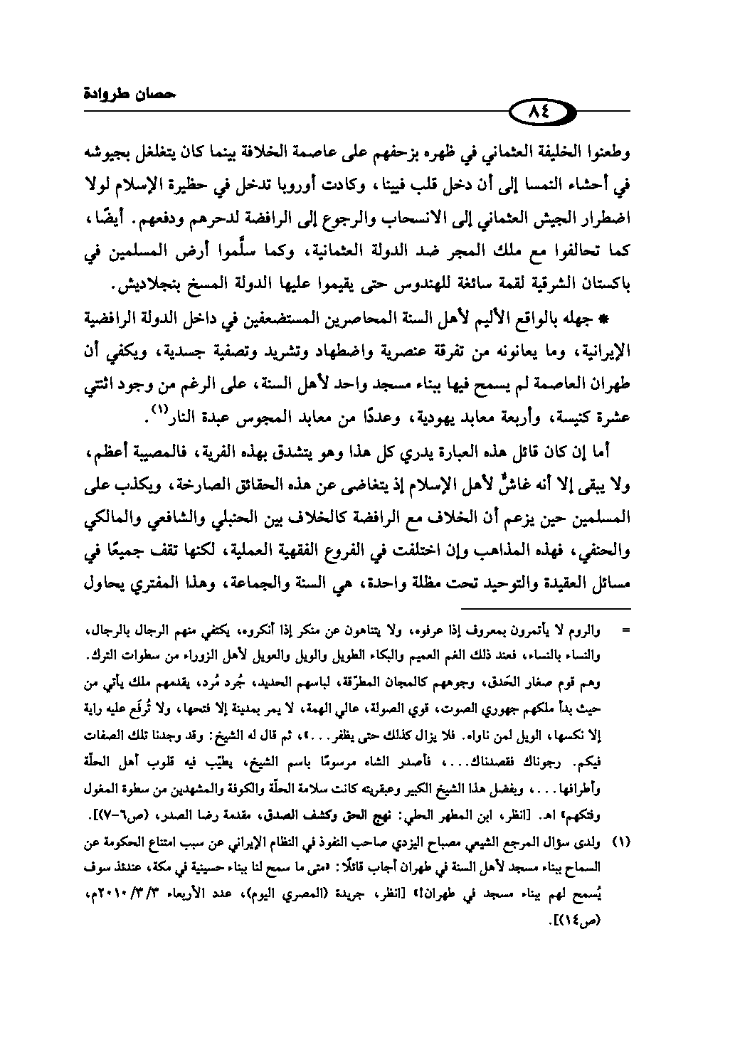 (¬1) ولدى سؤال المرجع الشيعي مصباح اليزدي صاحب النفوذ في النظام الإيراني عن سبب امتناع الحكومة عن السماح ببناء مسجد لأهل السنة في طهران أجاب قائلًا: «متى ما سمح لنا ببناء حسينية في مكة، عندئذ سوف يُسمح لهم ببناء مسجد في طهران!» [انظر، جريدة (المصري اليوم)، عدد الأربعاء 3/ 3/2010م، ص (14)].