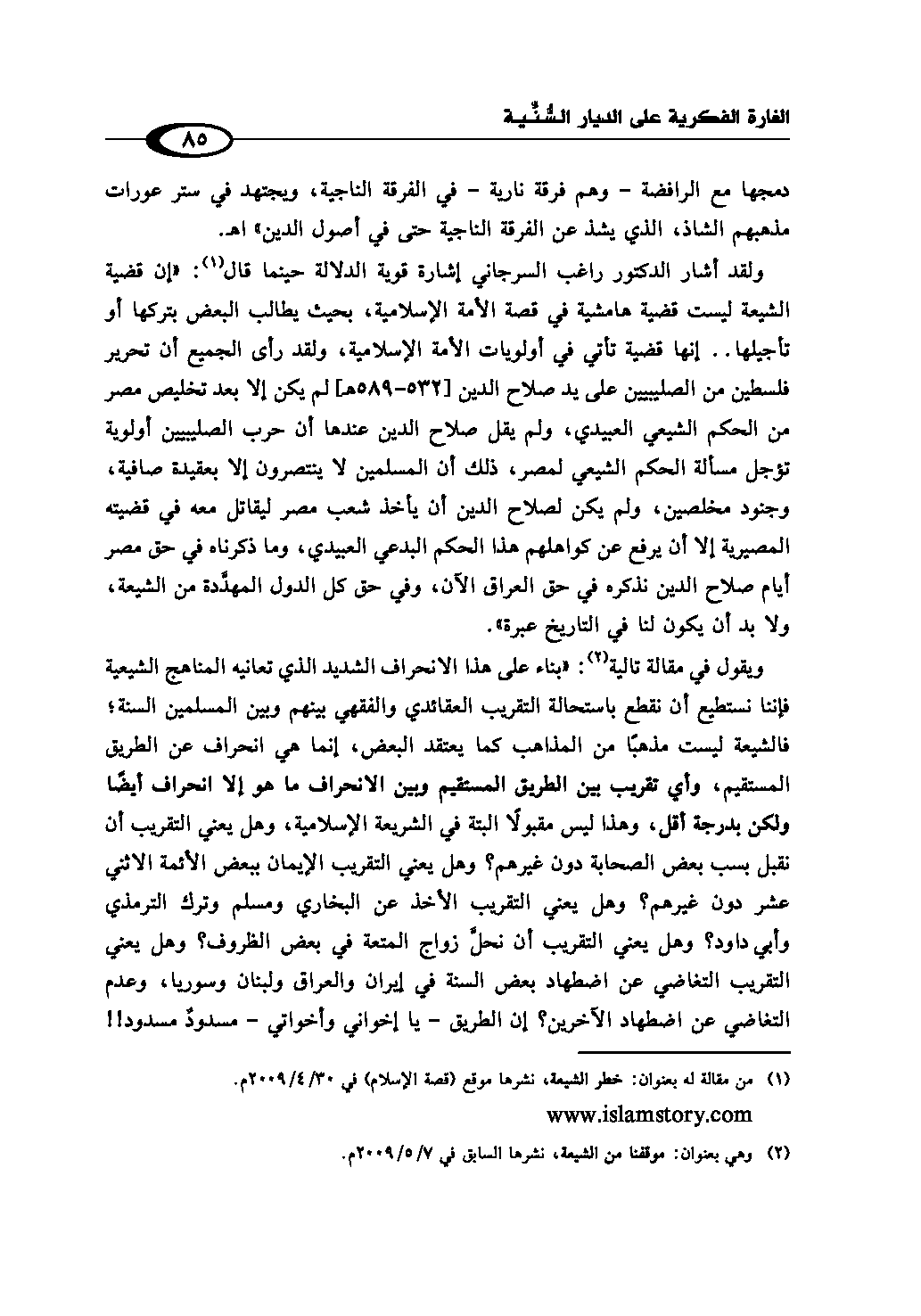 (¬1) من مقالة له بعنوان: خطر الشيعة، نشرها موقع (قصة الإسلام) في 30/ 4/2009م. www.islamstory.com