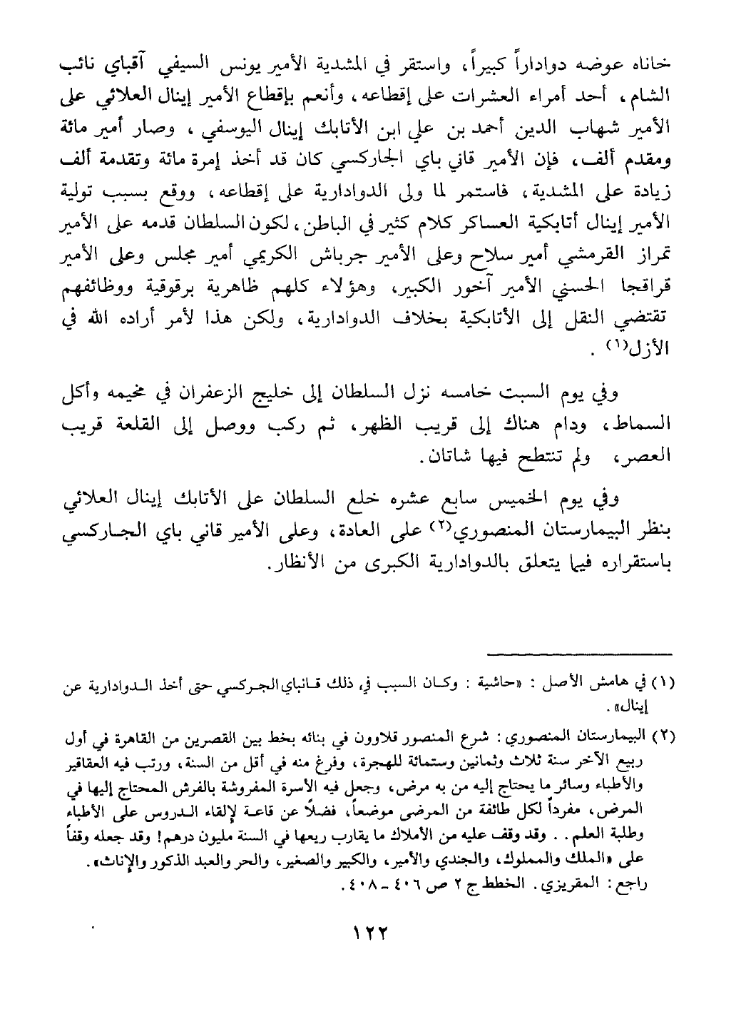 فإن قاتباي الجاركسي كان قد إذ أمره مائة وتقدمه ألف زيادة على المشدية فاستمر لما ولي الدوادارية على اقطاعه.
