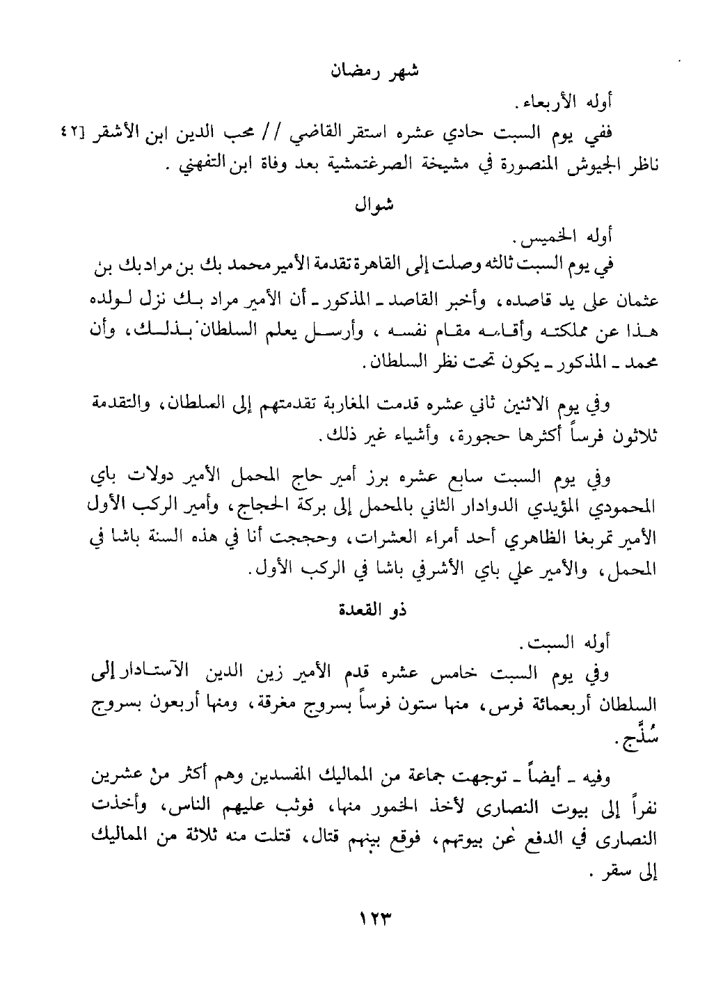 شوال أوله الخميس في يوم السبت ثالثه وصلت إلى القاهرة تقدمة محمد بك بن مراد بك ابن عثمان على يدي قاصده وأخبر القاصد أن والده نزل لولده هذا عن مملكته وأقامه مقام نفسه وأرسل يعلم السلطان بذلك وان يكون الولد تحت نظر السلطان.