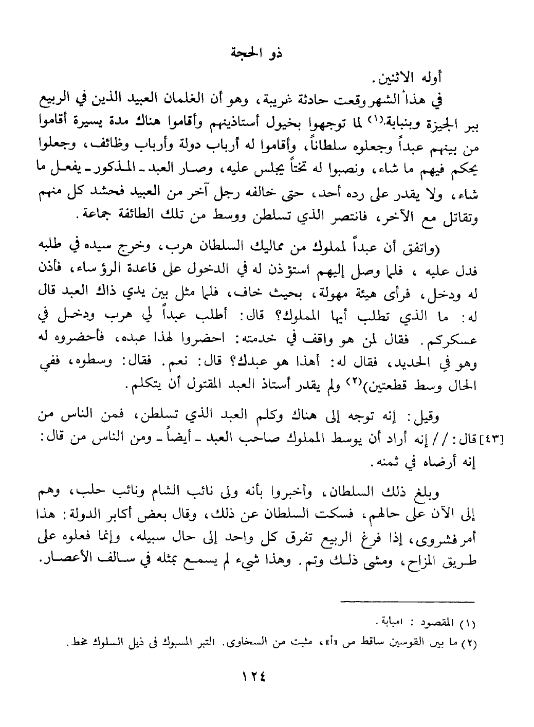 ذو الحجة أوله الاثنين في هذا الشهر وقعت حادثة غريبة وهي أن العبيد الغلمان الذين في الربيع ببر الجيزية ومنبابة لما توجهوا بخيول أستاذيهم وأقاموا هناك يسيرا أقاموا من بينهم عبدا وجعلوه سلطانا ورتبوا له أرباب دولة وأرباب وظائف وصار بحكم فيهم بما شاء ونصبوا له سختا يجلس عليه وبقي يفعل ما أحب ولا يقدر أحد على رده حتى خالفه رجل آخر من العبيد فحشدا وتقاتلا فانتصر الذي تسلطن ووسط من تلك الطائفة جماعة ولم يقدر أستاذ العبد المقتول أن يتكلم وقيل إنه توجه إلى هناك وكلم العبد المتسلطن فمن الناس من قال إنه رام أن يوسطه أيضا ومنهم من قال إنه أرضاه في ثمنه وبلغ السلطان ذلك وأتهم ولوا نائب الشام ونائب حلب وهم على حالهم إلى الآن فسكت السلطان عن ذلك وقال بعض أكابر الدولة هذا أمر فشار إذا فرغ الربيع تفرق كل منهم إلى حال سبيله وإنما فعلوا ذلك على سبيل المزاح ومشى ذلك وتم وهو شيء لم نسمع بمثله في سالف الأعصار.