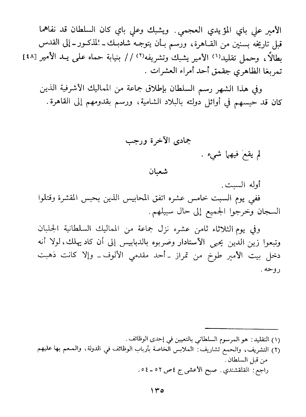 جمادى الآخرة ورجب لم يقع فيهما شيء شعبان أوله السبت في يوم السبت خامس عشرة اتفق المحابيس الذين بالمقشرة وقتلوا السجان وخرجوا بأجمعهم إلى حال سبيلهم.