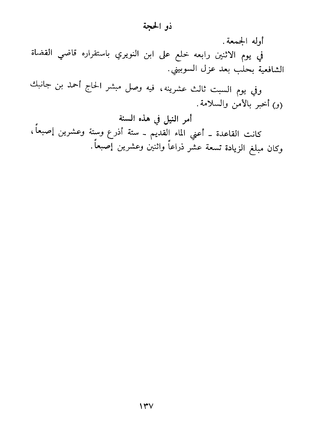 ذو الحجة أوله الجمعة في يوم الاثنين رابعه خلع علي ابن النويري باستقراره في قضاء الشافعية بحلب بعد عزل السوييني.