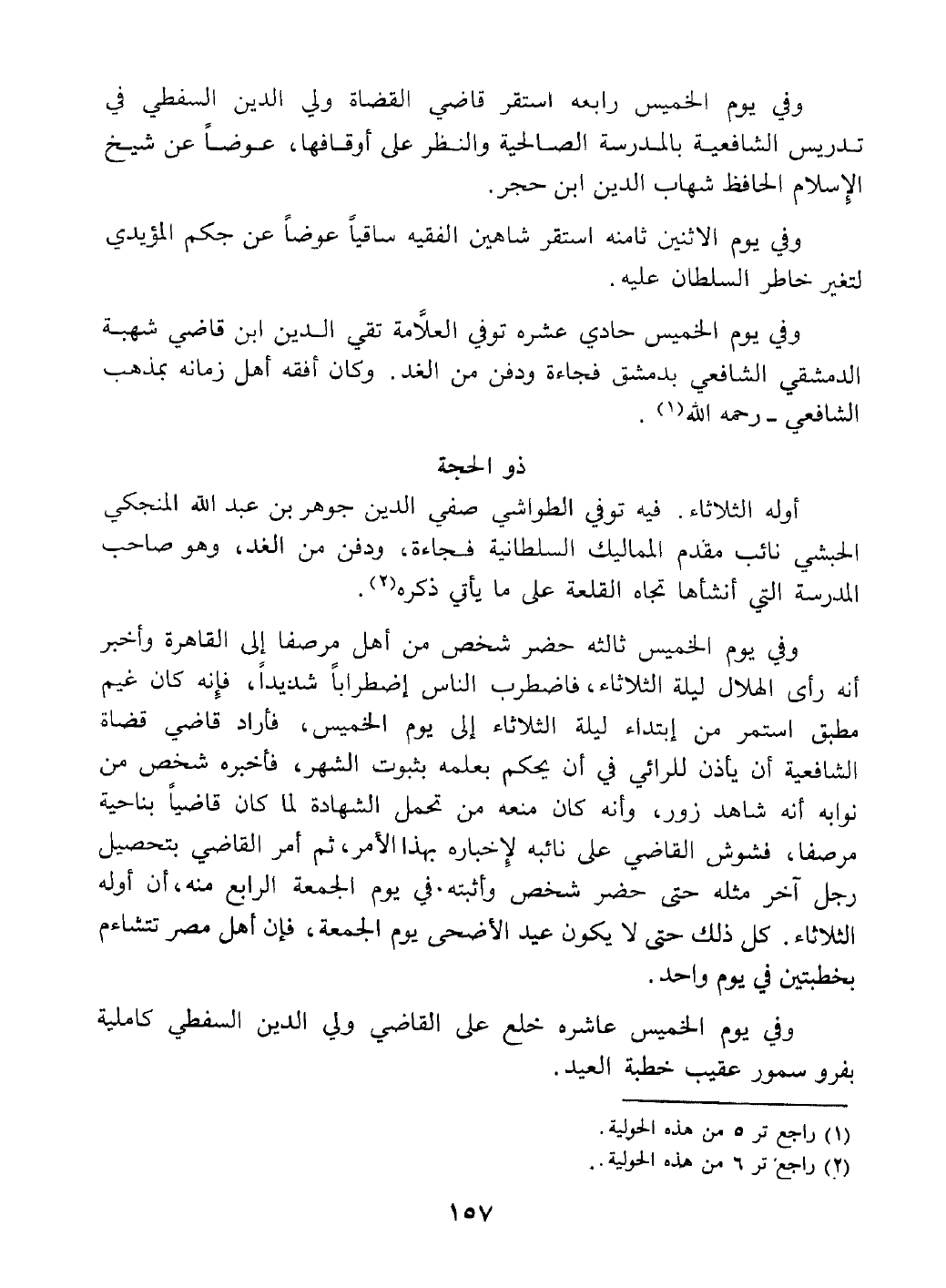 وفي يوم الخميس ثالثه حضر شخص من أهل مرصفا وأخبر إنه رأي الهلال ليلة الثلاثاء فاضطرب الناس اضطرابا شديدا فأنه كان غيم مطبق استمر من ابتداء ليلة الثلاثاء إلى يوم الخميس فأراد الولي السفطي قاي الشافعية أن يأذن للرائي في أن يحكم بعلمه بثبوت الشهر فأخبره بعض نوابه إنه شاهد زور وأنه كان منعه من تحمل الشهادة لما كان نائبا بمرصفا فشوش السفطي على هذا النائب المخبر بذلك ثم أمر الفحص عن آخر مثله فحضر واثبت في يوم الجمعة الرابع منه أن أوله الثلاثاء خوفا من كون عيد الأضحى يجيء الجمعة لتشاءم المصريين بخطبتين في يوم واحد وفي يوم الخميس عاشره خلع على القاضي ولي الدين السفطي كاملية بفرو وسمور عقب خطبة العيد.