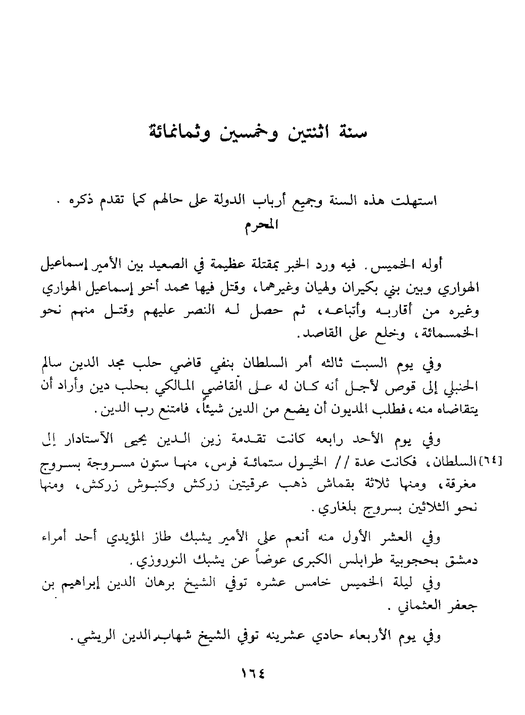 استهلت وجميع أرباب الدولة على حالهم في الماضية المحرم أوله الخميس فيه ورد الخبر بمقتله عظيمة في الصعيد بين إسماعيل الهواري وبين بني بكيران ولهيان وغيرهما وقتل فيها محمد أخو إسماعيل المذكور وغيره من أقاربه واتباعه ثم حصل له النصل عليهم وقتل منهم نحو خمسمائة وخلع على القاصد.