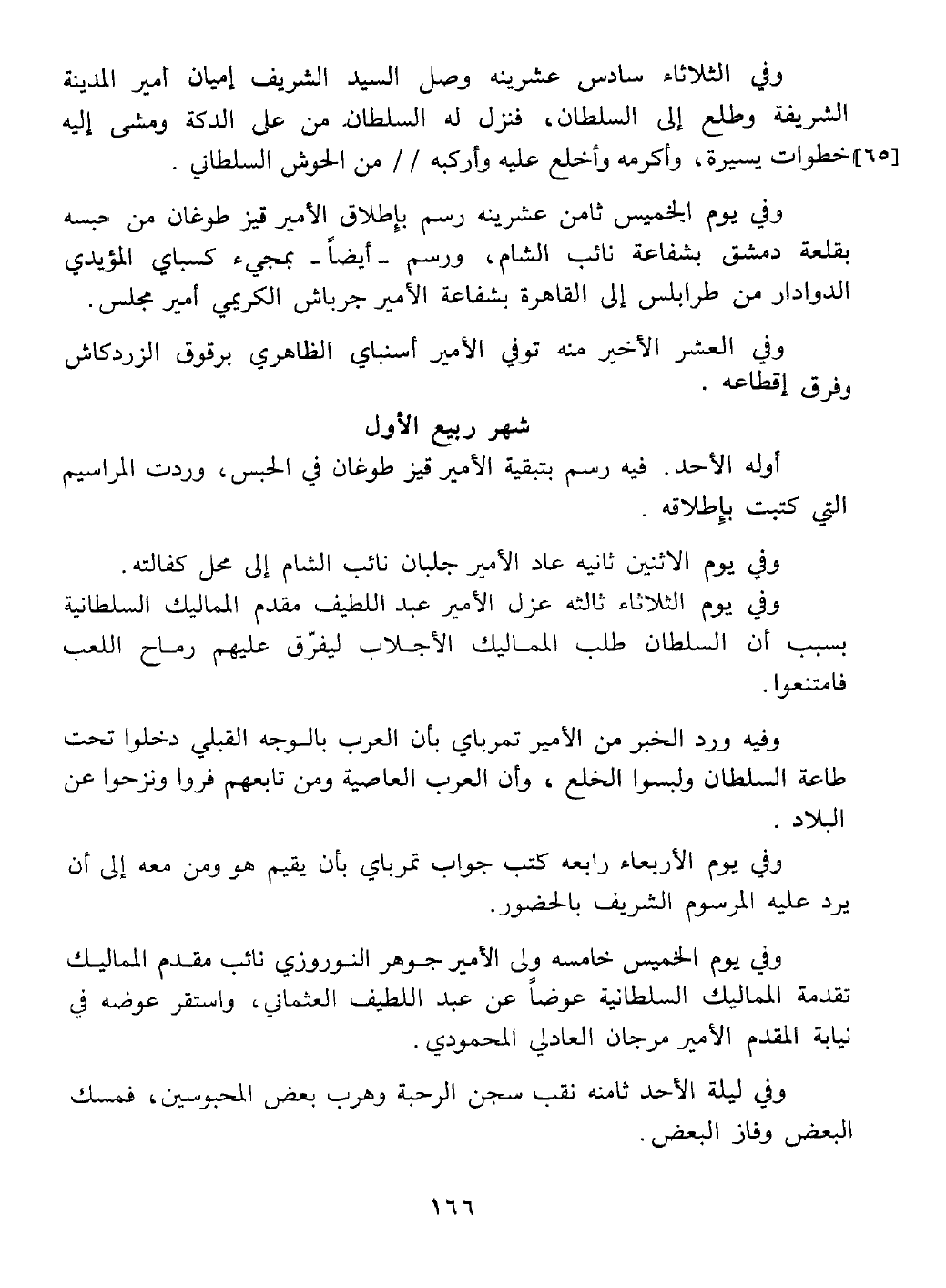 وفيه ورد الخبر من تمرباي بان العرب بالوجه القبلي دخلوا تحت طاعة السلطان ولبسوا الخلع وأن العرب العاصين ومن تابعهم فروا وبرحوا عن البلاد وفي يوم الأربعاء رابعه كتب جوابه بان يقيم هو ومن معه حتى يرد عليه الإذن في الحضور.