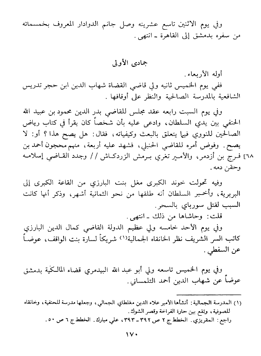 جمادى الأولى أوله الأربعاء في يوم الخميس ثانيه ولي شيخ الإسلام ابن حجر تدريس الشافعية بالصالحية والنظر على أوقافها.