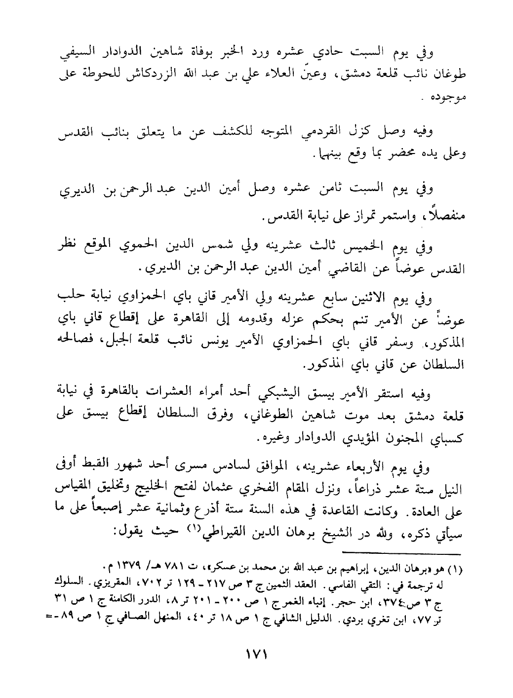 وفي يوم الخميس ثالث عشرينه ولي الشمس الحموي الموقع نظر القدس عوضا عن لقاضي أمين الدين عبد الرحمن ابن الدبري وفي يوم الأربعاء ثامن عشرينه الموافق لسادس مسري أحد شهور القبط وفي النيل ونزل المقام الفخري ابن السلطان ففتح السد بعد فعل المعتاد وللبرهان القراطي