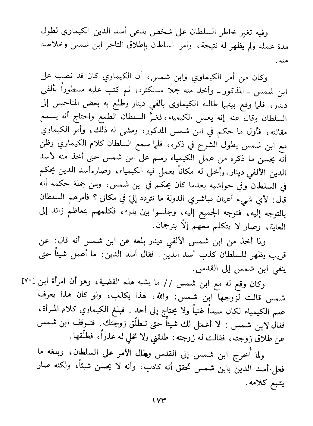 وفيه تغير السلطان على شخص يدعي أسد الدين الكيماوي أول مدة عمله الذي لم يظهر له نتيجة وأمر السلطان بإطلاق التاجر ابن شمس وخلاصة منه وكان من أمر الكيماوي وابن شمس أن الكيماوي نصب عله واخذ منه جملا مستكثرة ثم كتب عليه مسطورا بألفي دينار فلما وقع بينهما طالبة الكيماوي بهما وطلع به بعض المناحيس إلى السلطان وقال عنه إنه يعمل الكيمياء فغر السلطان الطمع واحتاج أن يسمع مقالته وأول ما حكم في ابن شمس المذكور ومشى له ذلك وأمر الكيماوي مع ابن شمس يطول الشرح بذكره فلما سمع السلطان كلام الكيماوي وظن إنه يحسن ما ذكره من عمل الكيمياء رسم علي ابن شمس حتى أخذ منه لأسد الدين المبلغ المكتتب وأخلى له مكانا لعمل الكيمياء وصار يحكم في السلطان وفي حواشيه بعد ما كان يحكم في ابن شمس ومن جملة حكمه إنه قال لأي شيء أعيان المباشرين لا يترددون إلى في مكاني فأمرهم السلطان بالتوجه إليه فتوجه الجميع إليه وجلسوا بين يديه فكلمهم بتعاظم زائد إلى الغاية وصار لا يتكلم معهم إلا بترجمان ولما أخذ من ابن شمس المبلغ المذكور بلغه عن ابن شمس إنه قال عن قريب يظهر للسلطان كذب أسد الدين فقال أسد الدين ما أعمل شيئا حتى ينفي أن شمس إلى القدس فأخرج إليه وكان وقع له مع ابن شمس ما يشبه هذه القضية وهو أن زوجة ابن شمس قال لزوجها الله أن هذا يكذب ولو كان يعرف علم الكيمياء لكان سعيدا غنيا لا يحتاج إلى أحد فبلغه كلام المرأة فقال لزوجها لا أعمل لك شيئا حتى تطلقها فتوقف عن طلاقها فقالت له زوجته طلقني ولا تترك له عذرا فطلقها فلما خرج ابن شمس إلى القدس وطال الأمر على السلطان وبلغه ما فعله أسد الدين بابن شمس تحقق إنه كاذب وانه لا يحسن شيئا ولكنه صار يتتبع كلامه.