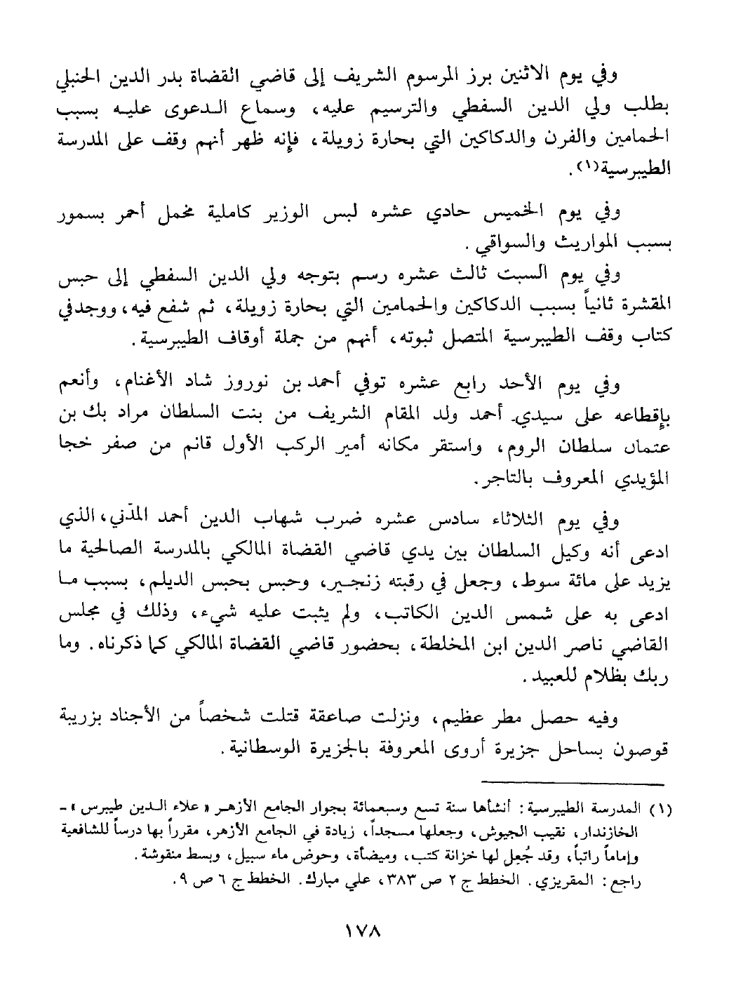 وفيه حصل مطر عظيم ونزلت صاعقة قتلت شخصا من الأجناد بزريبة قوصون بساحل جزيرة أروى المعروفة بالوسطانية.