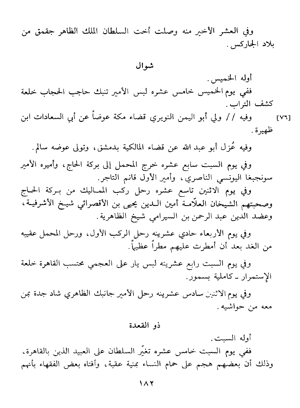 ذو القعدة أوله السبت في يوم السبت خامس عشرة تغير السلطان على العبيد الذين بالقاهرة كون بعضهم هجم على حمام النساء بمنية عقبة وافتاه بعض الفقهاء بأنهم