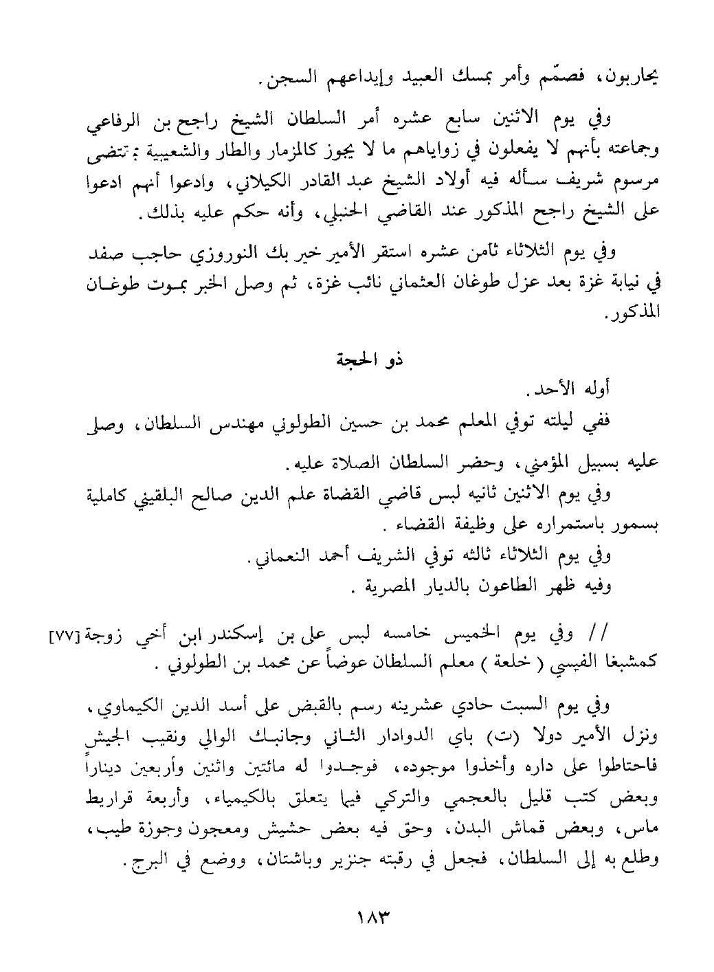 وفي يوم الاثنين سابع عشرة أمر السلطان راجح ابن الرفاعي وجماعه بأنهم لا يفعلون في زواياهم ما لا يجوز كالزمار والطار والشعبية بمقتضى مرسوم سأله فيه أولاد الشيخ عبد القادر الكيلاني وادعوا أنهم ادعوا راجح المذكور عند قاضي الحنابلة وأنه حكم عليهم بذلك.