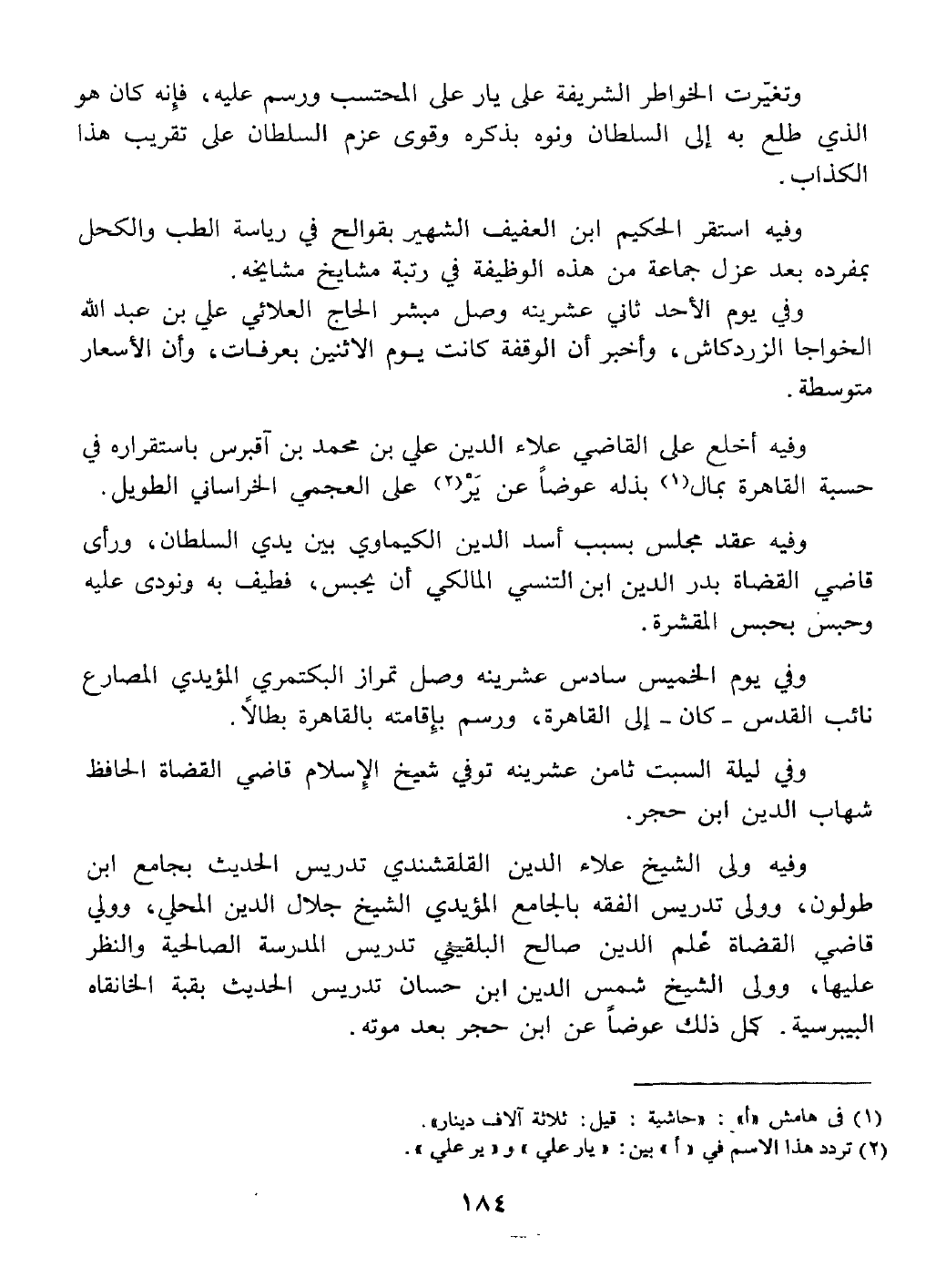 وتغيرت الخواطر السلطانية على المحتسب ورسم عليه لكونه هو الذي كان طلع به اللطان ونوه بذكره وقوي على تقريب هذا الكتاب.
