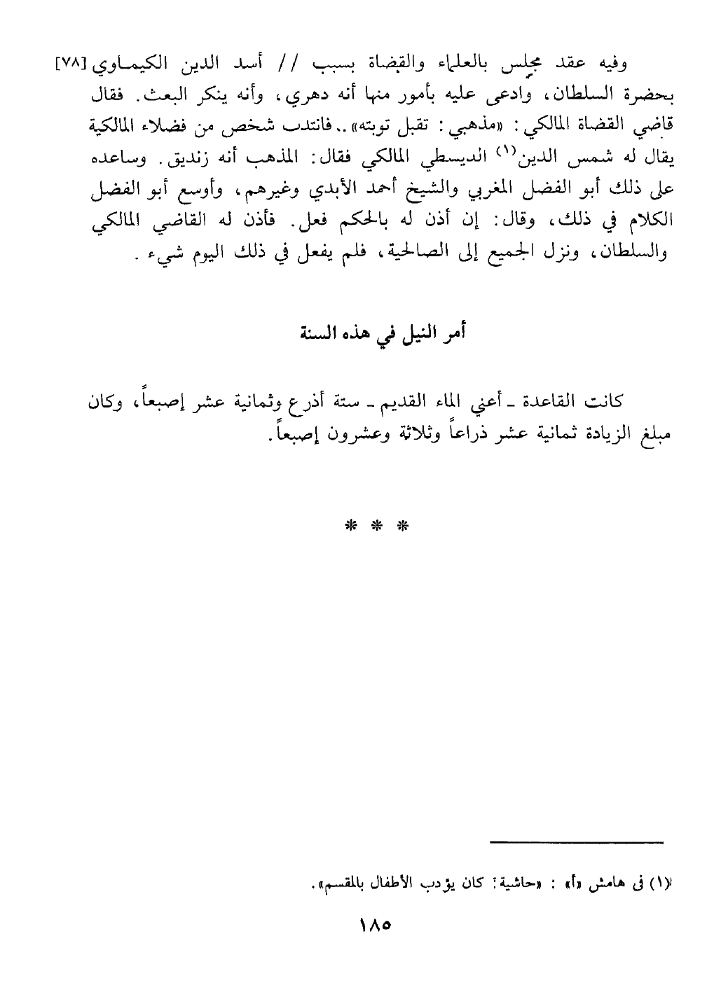 وفيه عقد مجلس بالعلماء والقضاة بسبب أسد الدين الكيماوي بحضرة السلطان وادعى عليه بأمور منها إنه دري وأنه ينكر البعث فقال قاضي المالكية مذهبي يقبل توبته فانتدب إليه شخصا من عقلاء المالكية يقال له الشمس الديسطي المالكي وقال المذهب أن زنديق وساعده على ذلك أبو الفضل المغربي والشيخ أحمد الأدبي وغرهما وأوسع أبو الفضل الكلام في ذلك وقال أن أذن له بالكم فعل فأذن له المالكي والسلطان ونزل الجميع إلى الصالحية فلم يفعل في ذلك سنة اليوم شيء.