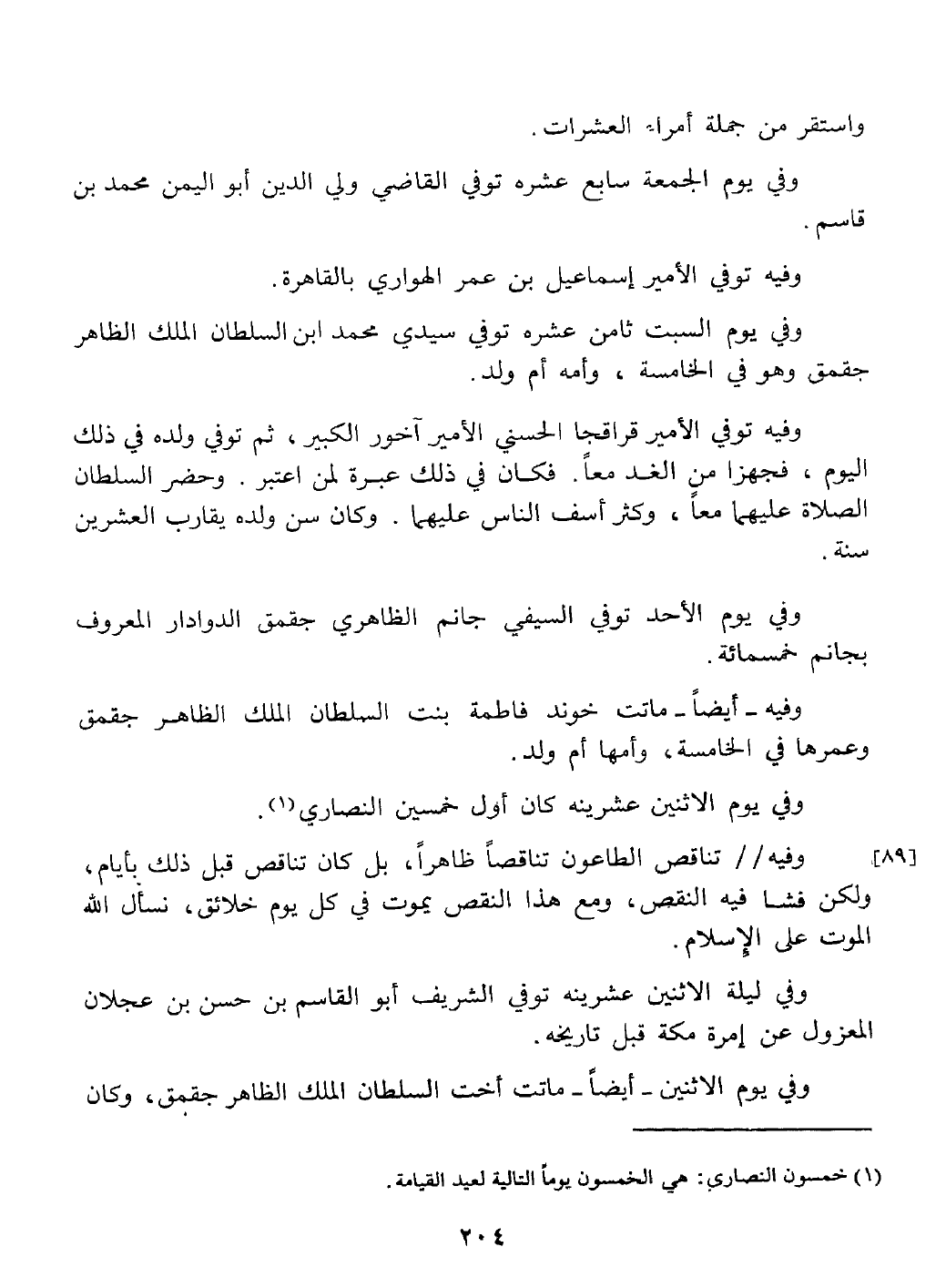 وفي يوم الأحد توفي جانم الظاهري جقمق الدوادار المعروف بجانم خمسمائة وخوند فاطمة ابنة السلطان الخماسية وأمها أم ولد وفي يوم الاثنين عشرة تناقص الطاعون ناقصا ظاهرا بل كان تناقص قبل ذلك بأيام ولكن فشا فيه النقص ومع ذلك فيموت كل يوم خلائق نسأل الله الموت على الإسلام وفي ليلة الاثنين عشرينه توفي الشريف أبو القسم بن حسن ابن عجلان المعزول عن إمرة مكة قبل وأخت السلطان
