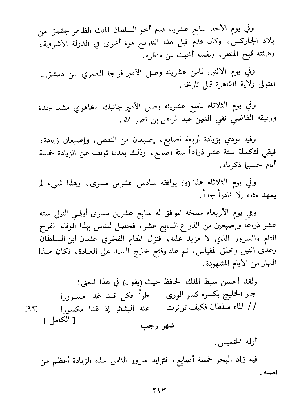 ونودي بزيادة أربعة أصابع فكمل النقص باثنين منها فبقي من الوفاء ستة أصابع في يوم الثلاثاء ويوافقه السادس والعشرون من مسرى وهو شيء لم يعهد مثله إلا نادرا وفي يوم الأربعاء سلخه وهو موافق لسابع عشري مسري وفي النيل ستة عشر ذراعا وإصبعين من السابع عشر فسر الناس بذلك غاية السرور ونزل المقام الفخري ابن السلطان فعدي النيل وخلق المقياس ثم عاد وفتح خليج السد على العادة فكان يوما مسهودا ولقد احسن سبط الملك الحافظ حيث يقول في هذا المعنى (الكامل) .