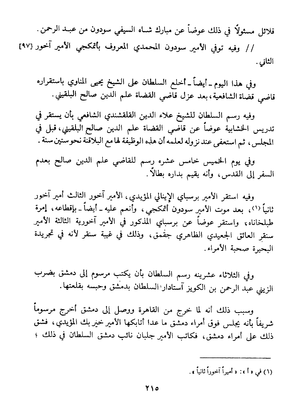قلائل مسؤولا في ذلك عوضا عن مبارك شاه السيفي سودون من عبد الرحمان وتوفي سودون المحمدي اتمكجي أمير آخور ثاني.