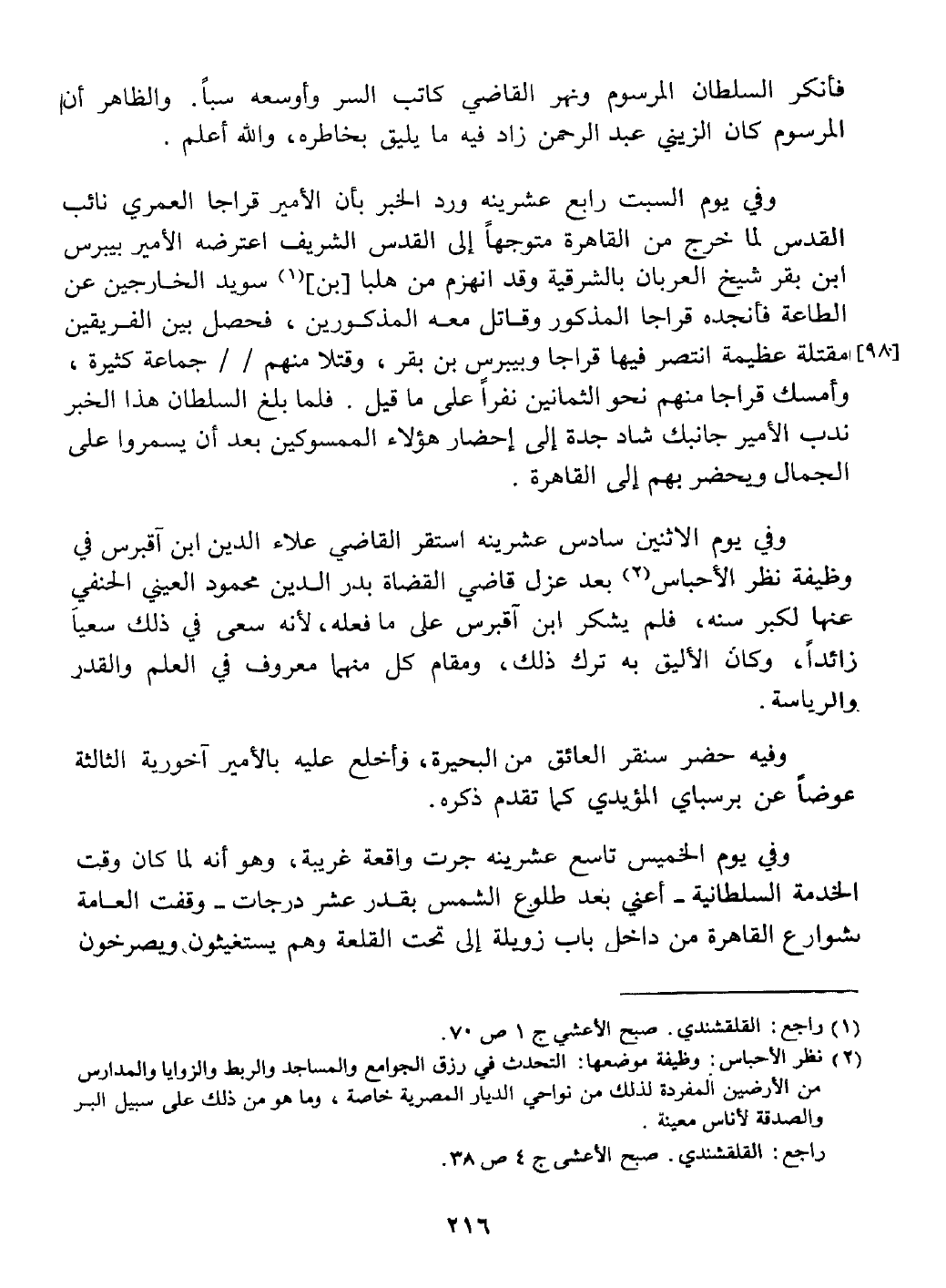 وفي يوم الست رابع عشرينه ورد الخبر بأن قراجا نائب القدس اعترضه في توجهه إلى القدس بيبرس بن بقر شيخ العربان بالشرقية وقد انهزم من هلبا سويد الخارجين عن الطاعة فتجده قراجا وقاتل عه فكان الظفر لهما بعد مقتلة عظيمة وقتلا منه جماعة كثرين وقبض على نحو الثمانين فيما قيل فلما بلغ السلطان الخبر ندب جانبك شاد جدة إلى إحضار الممسوكين إلى القاهرة بعد تسميرهم على الجمال.