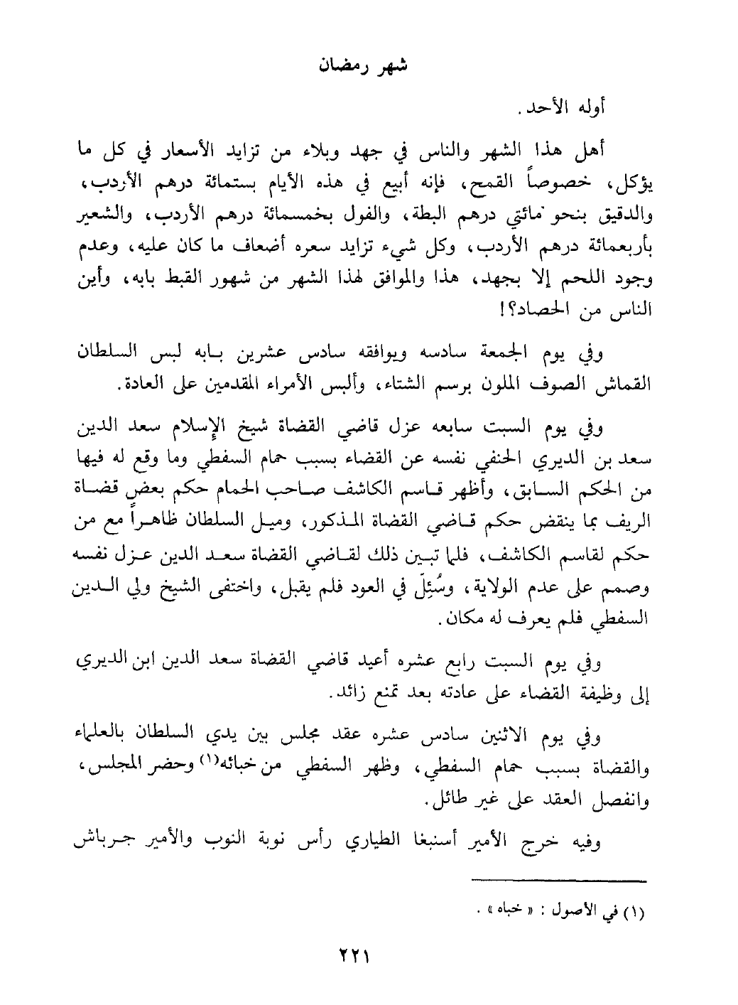 رمضان أوله الأحد أهل والناس في جهد وبلاء من تزايد الأسعار في كل ما يؤكل خصوصا القمح فأنه أبيع بستمائة والفول بخمسمائة والشعير بأربعمائة والدقيق بنحو مائتين البطة وكل شيء تزايد شعره أضعاف ما كان عليه وعز وجود اللحم إلا بجهد هذا والموافق لهذا الشهر من شهور القبط بابة وابن الناس من الحصاد.