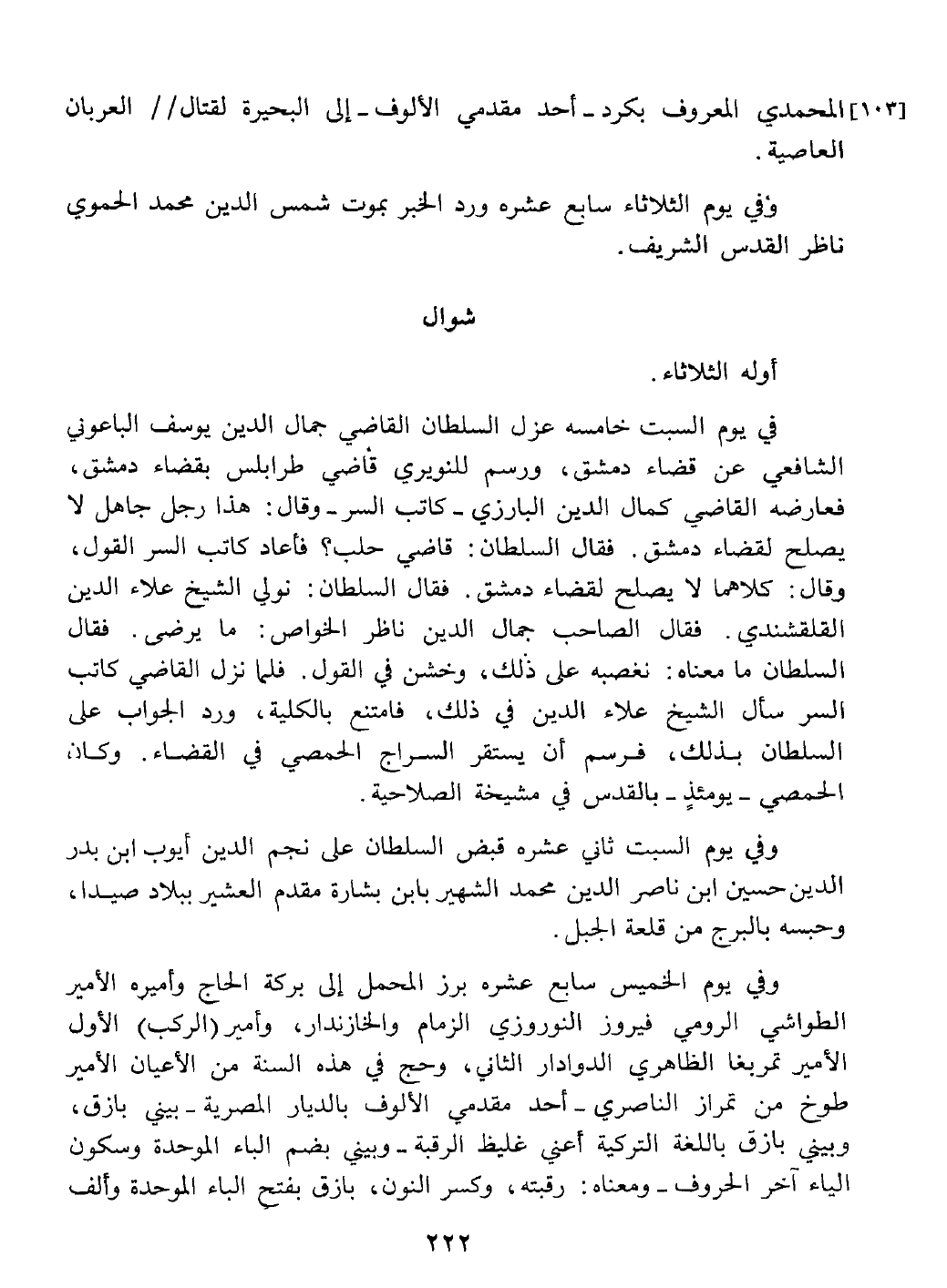 شوال أوله الثلاثاء وفي يوم السبت خامسه عزل الجمال يوسف الباعوني عن قضاء الشافعية بدمشق ورسم السلطان للنويري قاضي طرابلس به فعارضه المال كاتب السر وقال هذا رجل جاهل لا يصلح لقضاء دمشق فقال السلطان قاضي حلب فأعاد الكمال قوله بان ليهما لا يصلح لدمشق فقال السلطان نولي الشيخ علاء الدين القلقشندي فقال الجماني ناظر الخاص لا يرضي فقال له نغضبه عليه وخشن في القول فلما نزل الكمال سأل العلاء في ذلك فأمتنع بالكلية ورد الجواب على السلطان بذلك فرسم باستقرار السراج الحمصي وكان يومئذ شيخ الصلاحية القدسية.