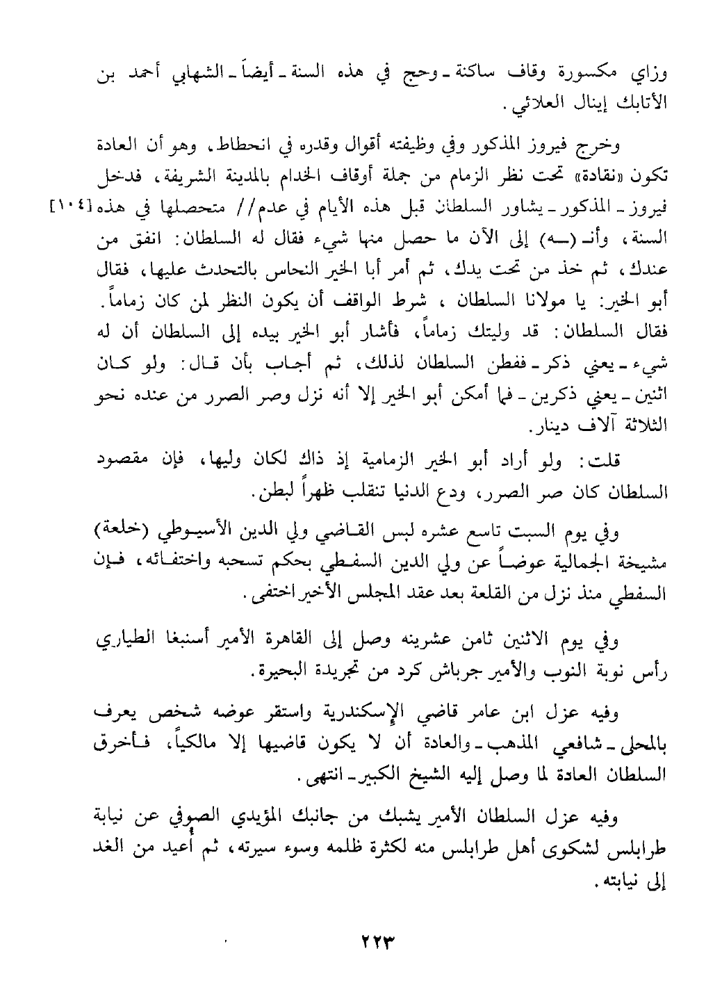 وزاي مكسورة ثم قاف والشهابي احمد بن ينال العلائي وسافر فيروز وفي وظيفته أقوال وقدرة في انحطاط لأن العادة أن نقادة وهي من جملة أوقاف الخدام بالمدينة الشريفة تكون تحت نظر الزمام فأعلم السلطان قبل هذه الأيام بعدم متحصلها في هذه السنة فقال له انفق من عندك ثم خذ مما يتحصل في المستقبل ثم أمر أبا الخير النحاس بالتحدث فيها فقال أبو الخير أن شرط النظر فيها لمن يكون زماما فقال قد وليتك زماما فأشار أبو الخير بيده أن له ذكرا فقال ولو كانا اثنين قد ولتك فما أمكنه إلا أن نزل وصر الحمل من عنده وهو نحو ثلاثة آلاف دينار وذا كان مقصود السلطان ولو انقلبت الدنيا ظهرا لبطن ولو أراد أبو الخير إذ ذاك الزمامية لوليها.