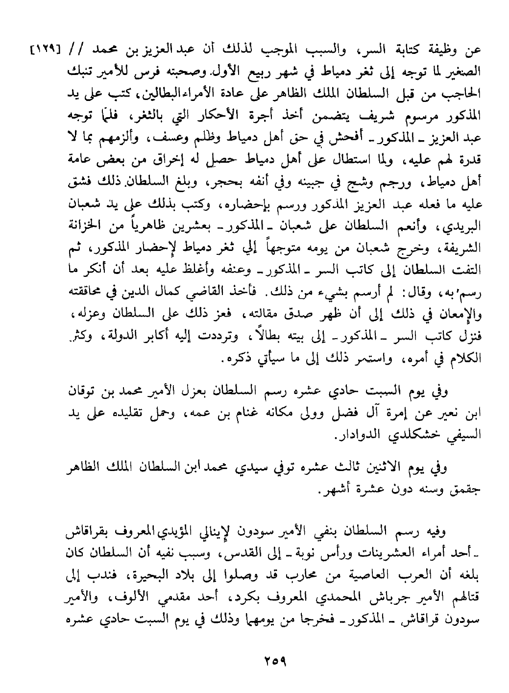 عن كتابة السر من أجل أن عبد العزيز بن محمد الصغير لما توجه لثغر دمياط في ربيع الأول وصحبته فرس لتنبك الحاجب من قبل السلطان على عادة الأمراء البطالين كتب على يده مرسوم يتضمن أخذ أجرة الاحتكار التي بالثغر فلما توجه افحش في حق أهل دمياط وظلم وعسف والزمهم بما لا قدرة لهم عليه واستطال عليهم فثار عليه بعض عامة أهل دمياط ورجمة وشجه في جبينه أو في أنفه بحجر وبلغ ذلك السلطان فشق عليه ما فعله المذكور ورسم بإحضاره وتوجه لذلك شعبان البريدي بعد أن أنعم السلطان عليه بعشرين ظاهريا من الخزاة الشريفة فخرج شعبان من يومه إلى الثغر لإحضار المذكور ثم التفت السلطان للكمال كاتب السر وعنفه واغلظ عليه بعد إنكاره ما كان رسم به وقال لم أرسم بشيء من ذلك فأخذ في محاققته وأمعن حتى ظهر صدق مقاله فعز على السلطان ذلك وعزله فنزل إلى بيته بطالا وتردد إليه أكابر الدولة وكثر الكلام في أمره واستمر إلى ما سيأتي.