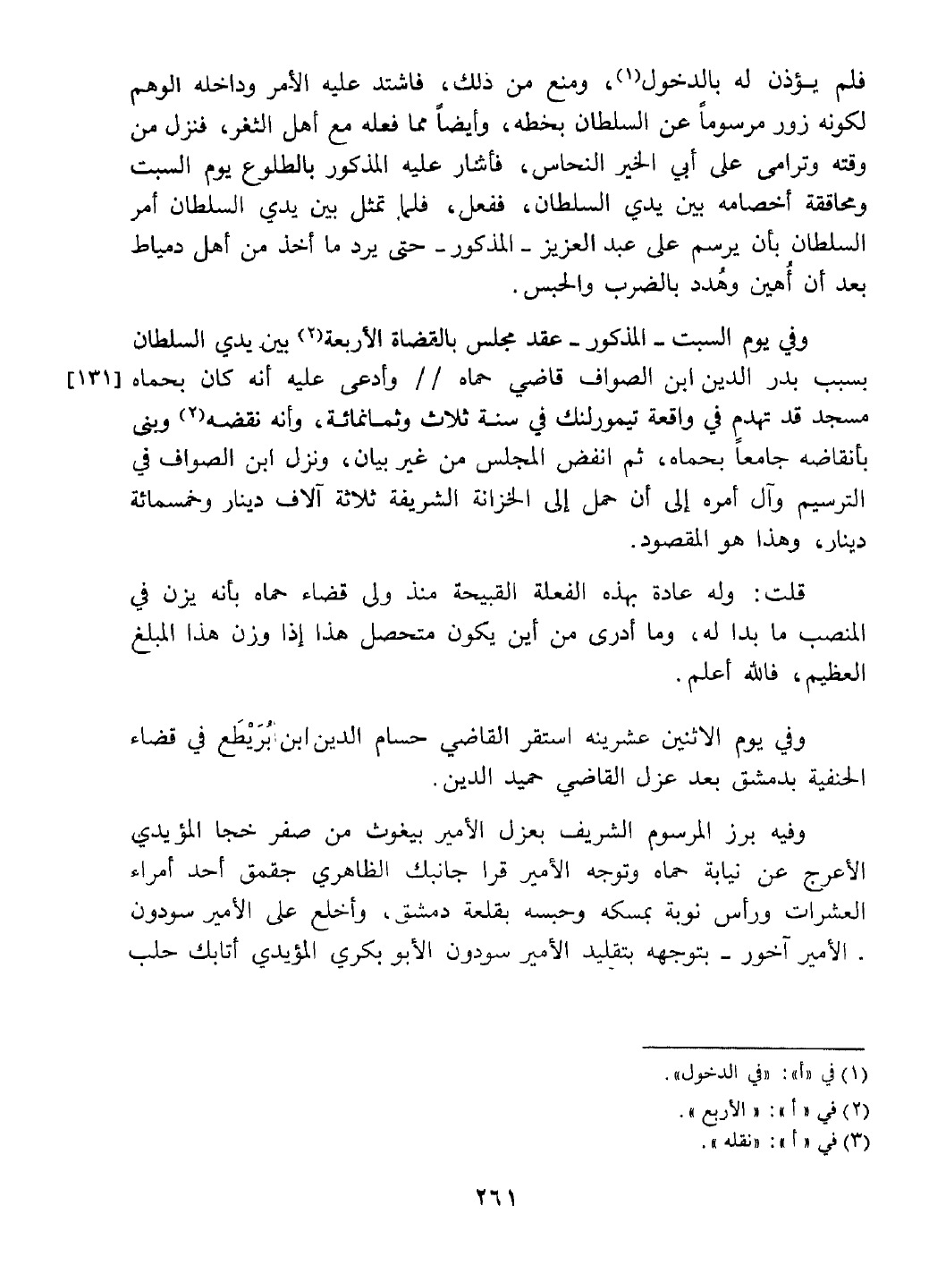 وفي يوم السبت المذكور عقد مجلس بالقضاة الأربعة بين يدي السلطان بسبب البدر ابن الصواف قاضي حماة وادعى عليه إنه كان بحماة مسجد قد تهدم في واقعة تيمورلنك سنة ثلاث وثماني مائة وإنه نقله وبنى بأنقاضه جامعا بحماة ثم انفض المجلس من غير بيان في الترسيم وآل أمره إلى أن مل إلى الخزانة ثلاثة آلاف دينار وخمسمائة وهذا هو المقصود قلت وله عادة بهذا الفعل القبيح منذ ولي قضاء حماة يزن في المنص ما بدا له وما أدري من أين يتحصل هذا المبلغ العظيم ذا وزنه فالله أعلم.