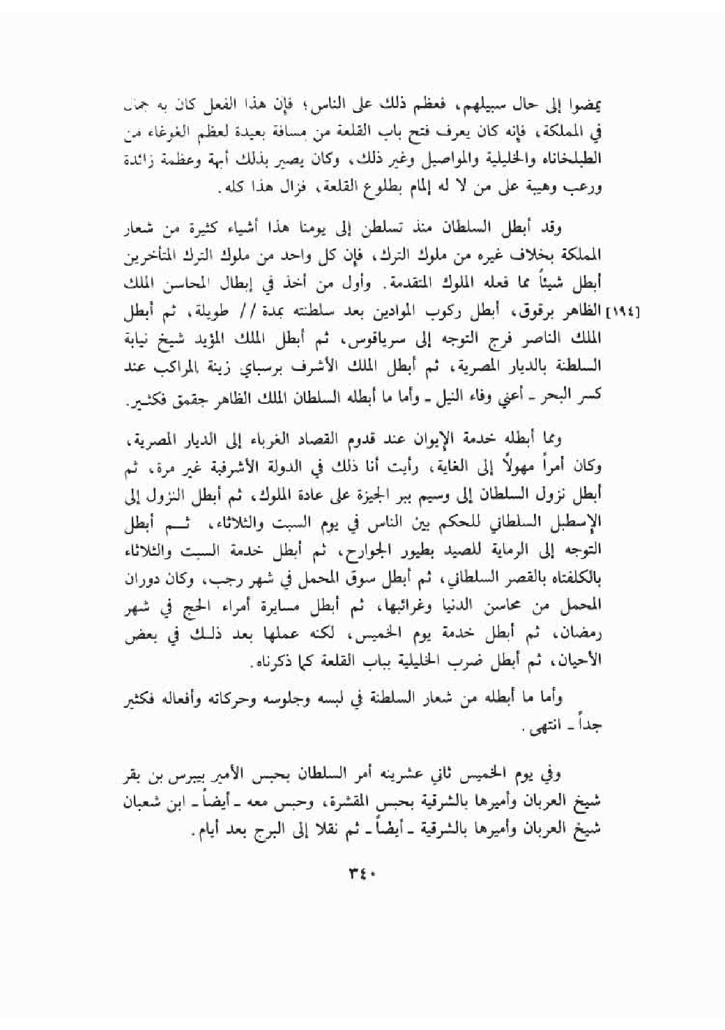 بالمضي لحال سبيلهم فعظم ذلك على الناس لما كان به للقلعة من الجمال الذي يعرف به فتح باب القلعة من مسافة بعيدة لعظم الغوغاء من الطبلخانات والخيليلة والمواصيل وغير ذلك وكان يصير به أبهة وعظمة زائدة ورعب وهيبة لمن لا إلمام له بطلوع القلعة فزال هذا كله وقد ابطل السلطان منذ تسلطن وإلى تاريخه أشياء كثيرة من شعار المملكة بخلاف غيره من ملوك الترك فان كل واحد من ملوك الترك المتأخرين ابطل شيئا مما فعله الملوك الترك فان كل واحد من ملوك الترك المتأخرين ابطل شيئا مما فعله الملوك المتقدمون وأول من أخذ في إبطال المحاسن الظاهر برقوق ابطل ركوب الموادين بعد سلطنته بمدة طويلة ثم ابطل الناصر فرج التوجه لسرياقوس ثم ابطل المؤيد شيخ نيابة السلطنة بالديار المصرية ثم أبطل الأشراف زينة المراكب عند وفاء النيل وإما ما أبطله السلطان فكثير فمن ذلك خدمة الإيوان عند قدوم القصاد الغرباء إلى الديار المصرية وكان أمراً مهولا إلى الغاية رأيت أنا ذلك في الدولة الاشرفية غير مرة م ابطل نزول السلطان إلى وسيم ببر الجيزة على عادة الملوك ثم ابطل النزول إلى الإسطبل للحكم وبين الناس في يوم السبت والثلاثاء ثم ابطل التوجه إلى الرمي للصيد بطيور الجوارح ثم ابطل خدمة السبت والثلاثاء بالكفاة بالقصر السلطاني ثم ابطل سوق المحمل في رجب وكان من محاسن الدنيا وغرائبها ثم أبطل مسايرة أمراء الحج في رمضان ثم أبطل خدمة الخميس لكنه عملها بعد ذلك أحيانا ثم أبطل ضرب الخليلية بباب القلعة كما ذكرناه خارجا عما أبطله من شعار السلطنة فيلبسه وجلوسه وحركاته وأفعاله وذلك أيضاً كثير جداً.