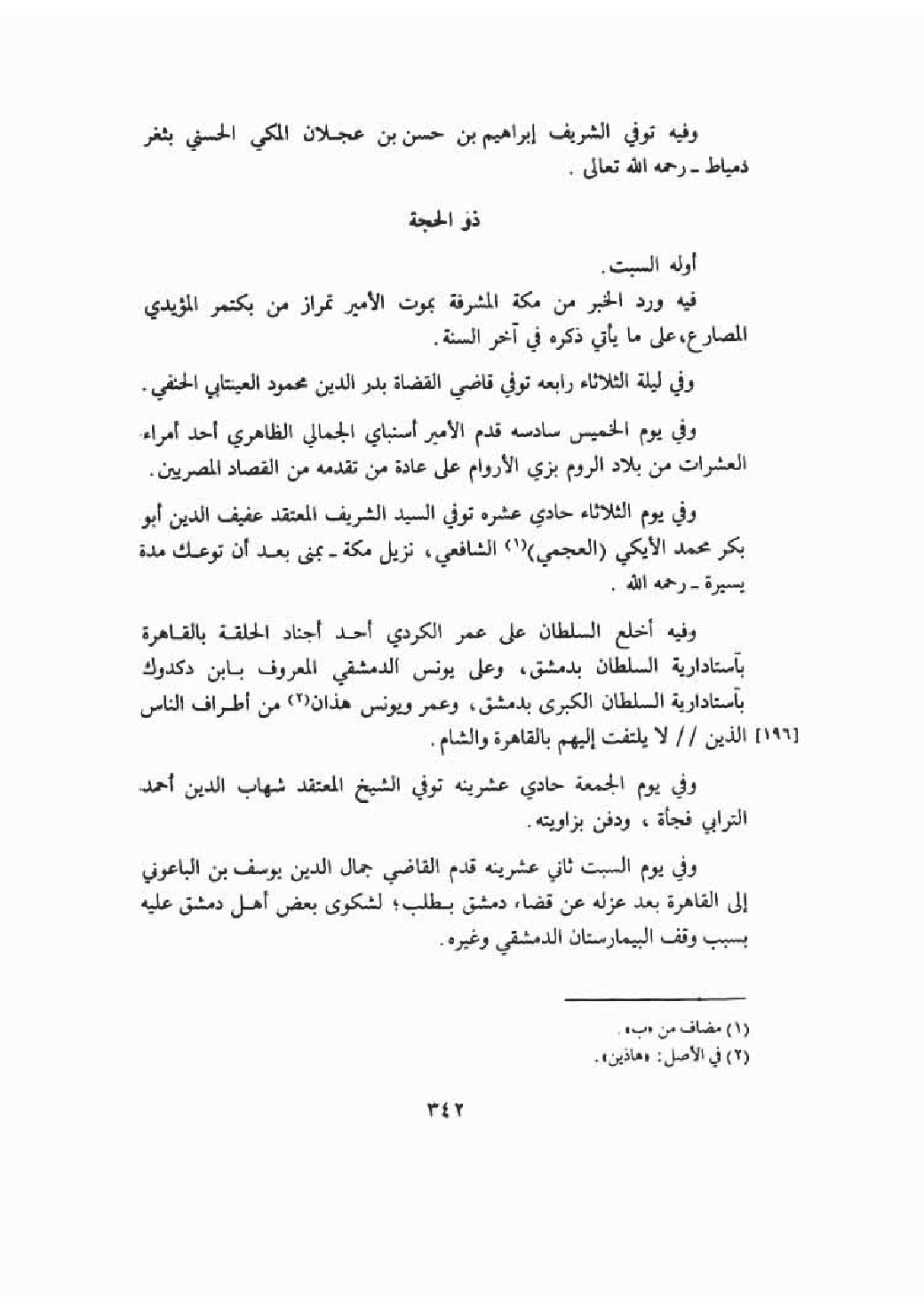 وفيه توفي الشريف إبراهيم بن حسن بن عجلان الحسنى المكي بثغر دمياط فو الحجة أوله السبت فيه ورد الخبر من مكة بموت تمراز المصارع على ما سيأتي في الوفيات.