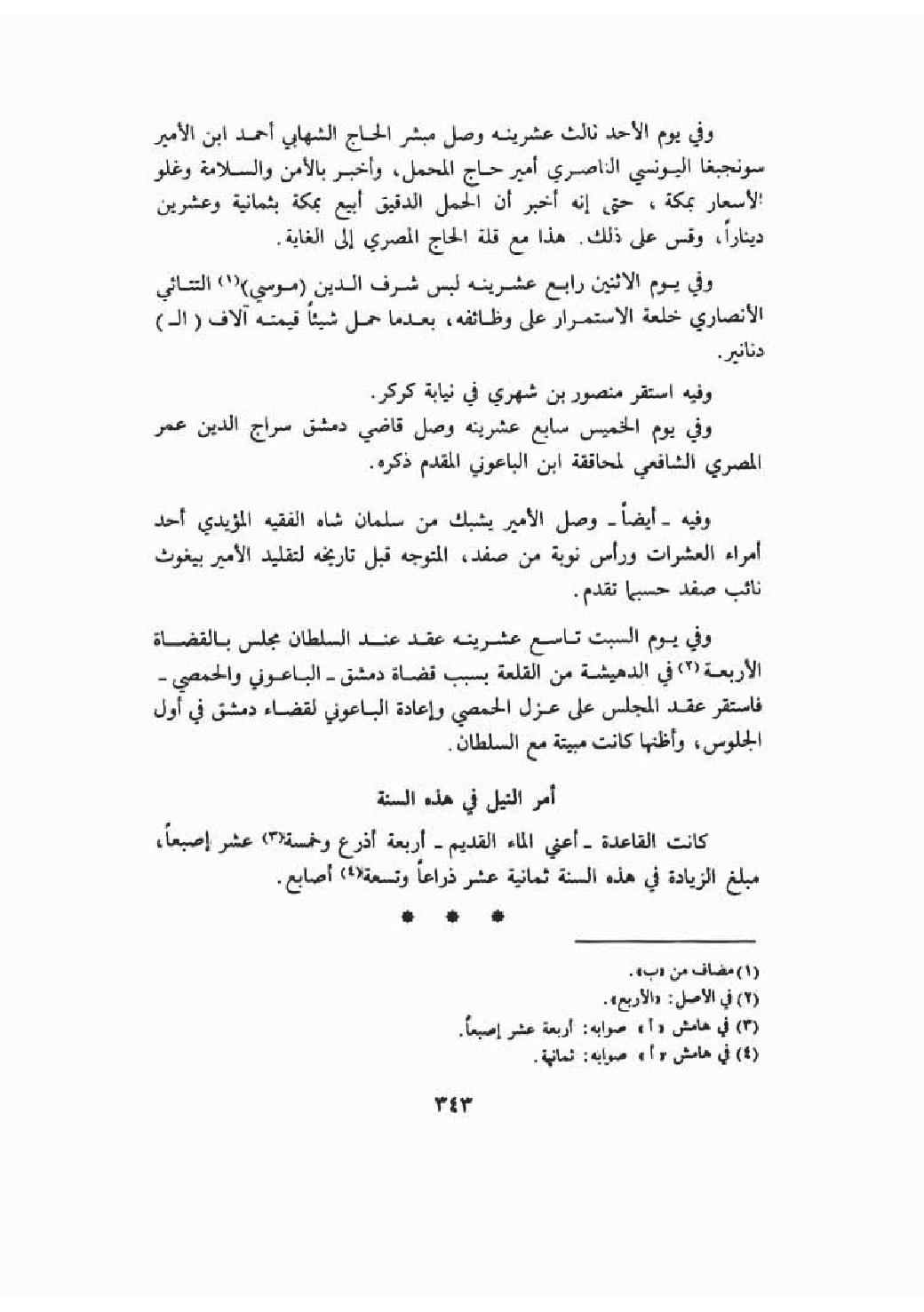 وفي يوم الأحد ثالث عشرينه وصل مبشر الحاج الشهابي أحمد بن أمير حاج المحمل سونجبغا اليونسي الناصري وأخبر بالأمن والسلامة وغلاء الأسعار بمكة حتى إنه أخبر أن حمل الدقيق بيع بمكة بثمانية وعشرين دينارا مع قلة الحاج المصري إلى الغاية وقس على هذا.