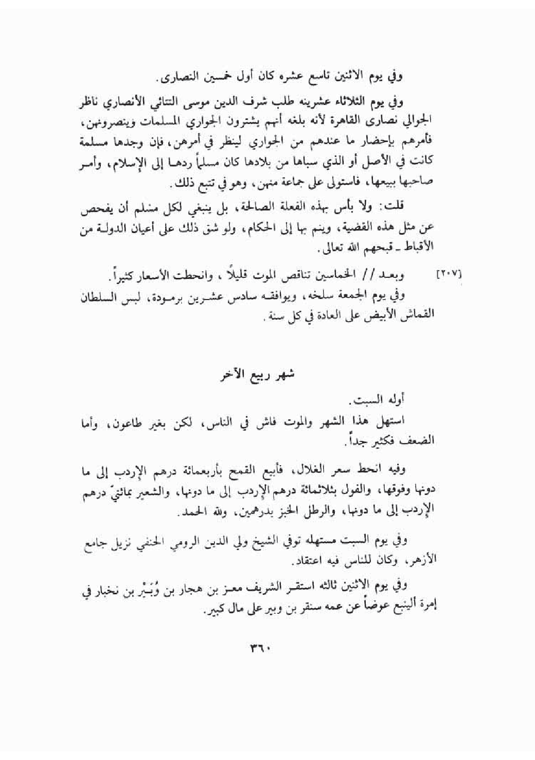 وفي يوم الثلاثاء عشريه طلب الشرف الأنصاري ناظر الجوالي نصارى القاهرة لكونه بلغه إنهم يشترون الجواري المسلمات وينصرونهن فأمرهم بإحضار من عندهم منهن لينظر في أمرهن فمن وجدها مسلمة في الأصل أو سابيها ردها إلى الإسلام وأمر صاحبها ببيعها فاستولى على جماعة منهن وهو في تتبع ذلك وهذا فعل لا بأس به وينبغي لكل مسلم الفحص عن ذلك وإيصال شأنه إلى الحكام ولو شق على أعيان الدولة الأقباط قبحهم الله.
