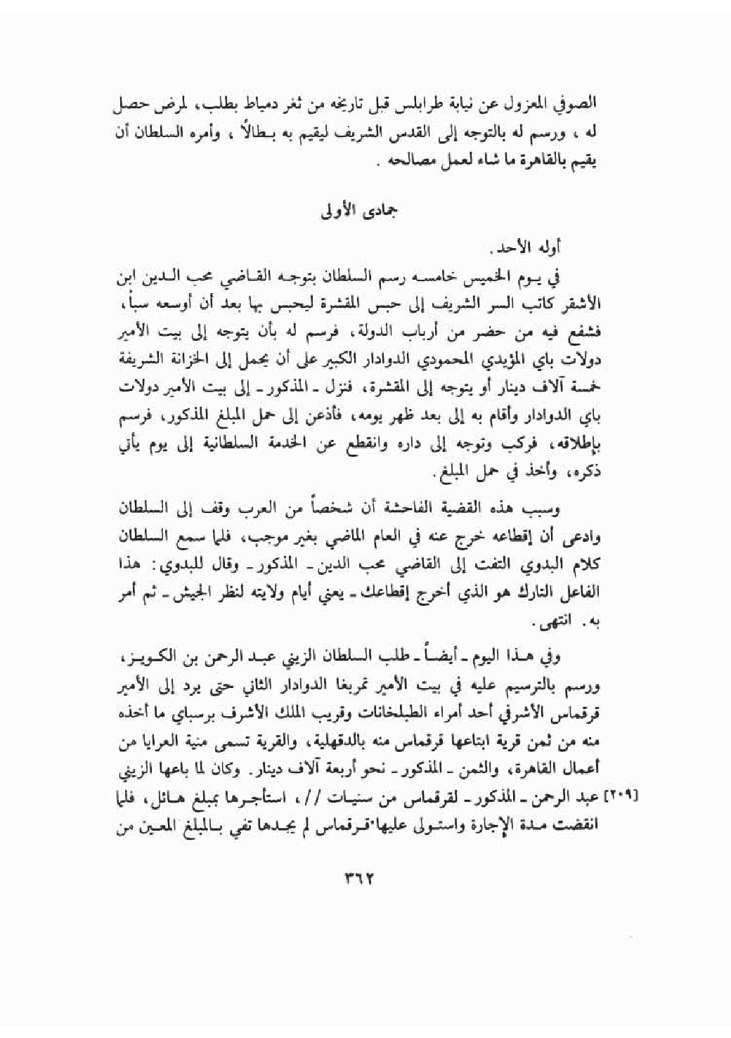 وفي هذا اليوم أيضاً طلب السلطان الزيني ابن الكويز ورسم بالترسيم عليه ببيت الدوادار الثاني تمربغا حتى يرد لقرقماش الاشرفي ما أخذه منه من ثمن قريةٍ ابتاعها قرقماش منه بالدقهلية تسمى منية العرايا من أعمال القاهرة وهو أربعة آلاف دينار وكان لما باعا الزيني للمذكور استأجرها منه سنين بمبلغ هائل فلما انقضت المدة واستولى عليها مالكها لم يجدها تفي بالمبلغ المعين من