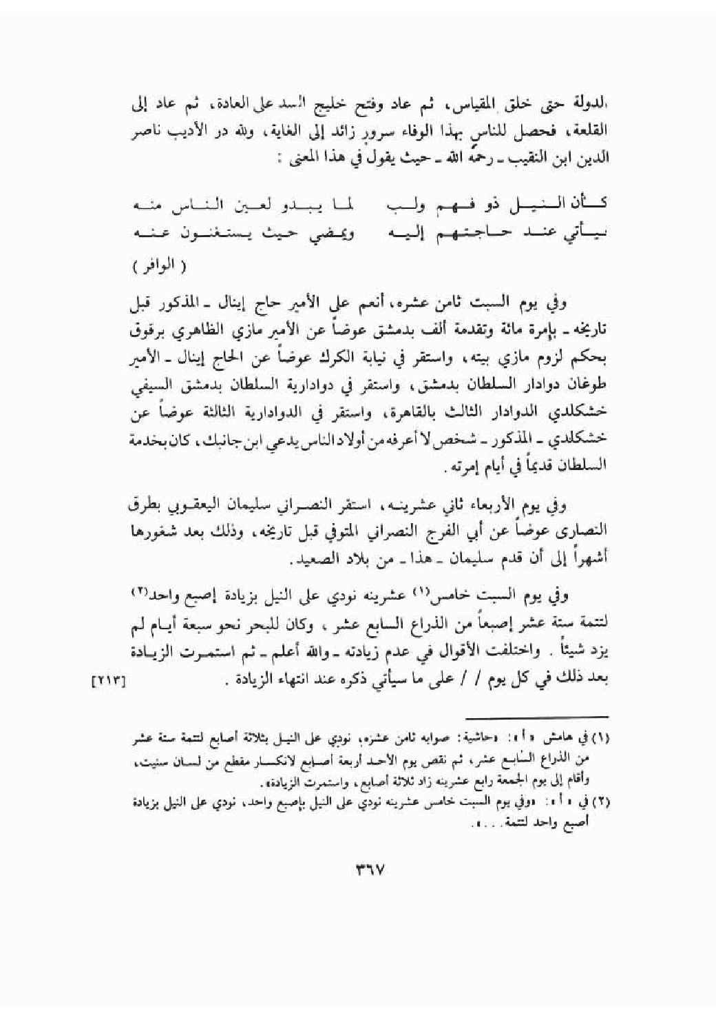 الدولة حتى خلق المقياس ثم عاد وفتح خليج السد علي العادة ثم عاد للقلعة فحصل للناس سرور زائد ولله در الأديب ناصر الدين ابن النقيب حيث يقول في هذا المعنى (الوافر)
