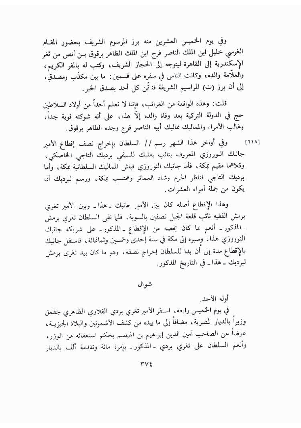 وفي يوم الخميس العشرين منه برز المرسوم بإحضار المقام لغرسي خليل بن الناصر فرج بن الظاهر برقوق من ثغر إسكندرية إلى القاهرة ليتوجه للحج وكتب له المقر الكريم والعلامة والده وصار الناس في سفره ما بين مصدق ومكذب فلما تم ذلك تحقق الحال كان ذلك من الغرائب فأنا لا نعلم أحد امن أولاد السلاطين حج في الدولة التركية بعد وفاة والده الناصر فرج وجده الظاهر برقوق.